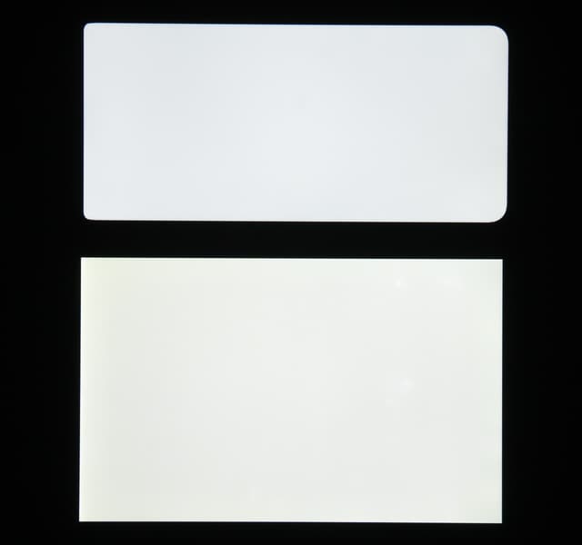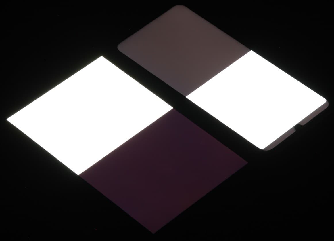 Яркость под углом у экранов уменьшилась (как минимум в 5 раз, исходя из разницы в выдержке), но у смартфона яркость под этим углом заметно ниже. Черное поле при отклонении по диагонали высветляется сильно, но остается условно нейтрально-серым (так видно глазами). Фотографии ниже это демонстрируют (яркость белых участков в перпендикулярном плоскости экранов направлении одинаковая!):