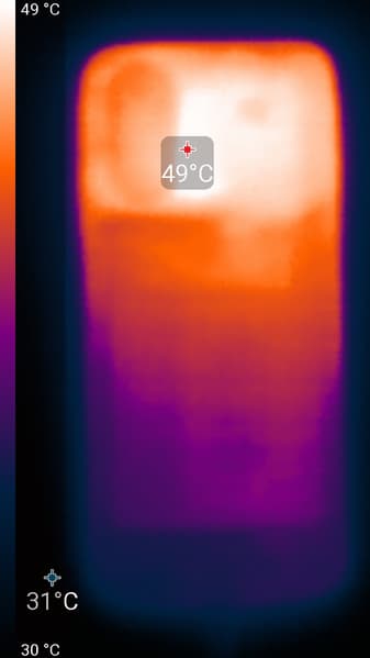 Нагрев больше в верхней части аппарата, что, видимо, соответствует расположению микросхемы SoC. По данным теплокамеры, максимальный нагрев составил 49 градусов (при температуре окружающего воздуха в 24 градуса), это очень сильный нагрев в случае данного теста в сравнении с другими современными смартфонами.
