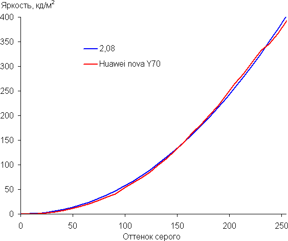 Контрастность (примерно в центре экрана) высокая — порядка 1300:1. Время отклика при переходе черный-белый-черный равно 21 мс (11 мс вкл. + 10 мс выкл.). Переход между полутонами серого 25% и 75% (по численному значению цвета) и обратно в сумме занимает 34 мс. Построенная по 32 точкам с равным интервалом по численному значению оттенка серого гамма-кривая не выявила завала ни в светах, ни в тенях. Показатель аппроксимирующей степенной функции равен 2,08, что ниже стандартного значения 2,2. При этом реальная гамма-кривая заметно отклоняется от степенной зависимости: