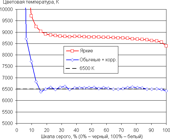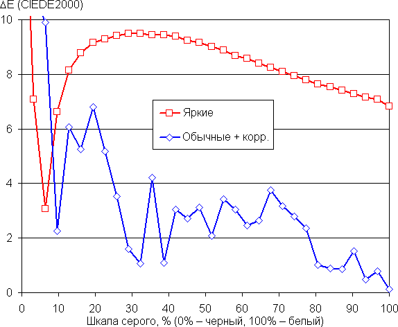 На графиках ниже кривые Яркие соответствуют результатам без какой-либо коррекции цветового баланса (профиль Яркие), а кривые Обычные + корр. — данным, полученным после выбора профиля Обычные и ручной коррекции цветового баланса (точка на круге коррекции — как на снимке выше). (Самые темные области шкалы серого можно не учитывать, так как там баланс цветов не имеет большого значения, да и погрешность измерений цветовых характеристик на низкой яркости большая.)