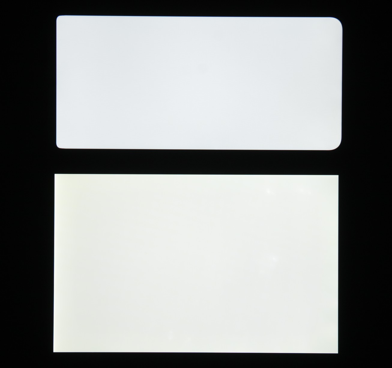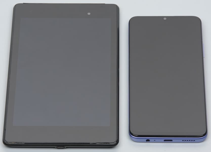 Лицевая поверхность экрана выполнена в виде стеклянной пластины с зеркально-гладкой поверхностью, устойчивой к появлению царапин. Судя по отражению объектов, антибликовые свойства экрана лучше, чем у экрана Google Nexus 7 (2013) (далее просто Nexus 7). Для наглядности приведем фотографию, на которой в выключенных экранах отражается белая поверхность (слева — Nexus 7, справа — Huawei Nova Y70, далее их можно различать по размеру):