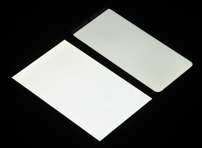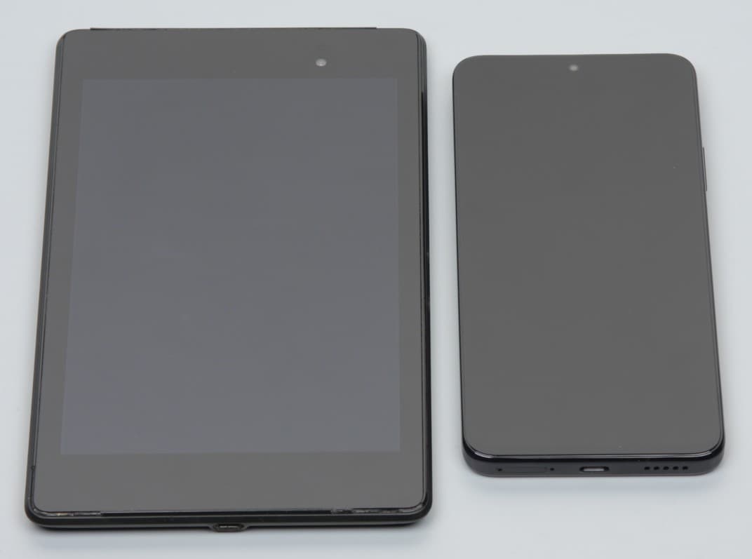 Лицевая поверхность экрана выполнена в виде стеклянной пластины с зеркально-гладкой поверхностью, устойчивой к появлению царапин. Судя по отражению объектов, антибликовые свойства экрана лучше, чем у экрана Google Nexus 7 (2013) (далее просто Nexus 7). Для наглядности приведем фотографию, на которой в выключенных экранах отражается белая поверхность (слева — Nexus 7, справа — Huawei Nova Y90, далее их можно различать по размеру):