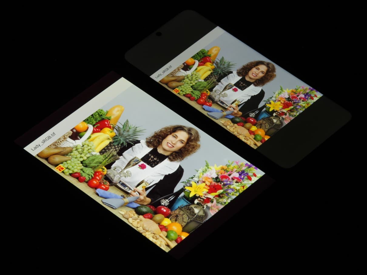 Цвета на экране смартфона имеют насыщенность немного выше естественной, а цветовой баланс у экранов различается. Напомним, что фотография не может служить надежным источником сведений о качестве цветопередачи и приводится только для условной наглядной иллюстрации. Причина в том, что спектральная чувствительность матрицы фотоаппарата неточно совпадает с этой характеристикой человеческого зрения.