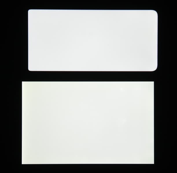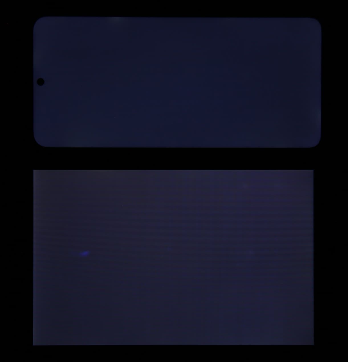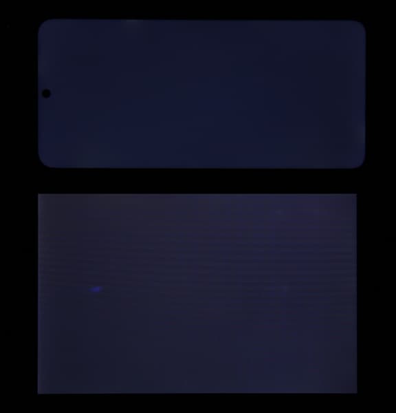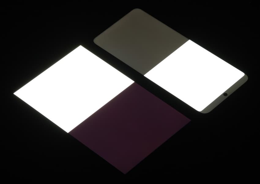 Яркость под углом у экранов уменьшилась (как минимум в 5 раз, исходя из разницы в выдержке), но у смартфона яркость под этим углом заметно ниже. Черное поле при отклонении по диагонали высветляется сильно, но остается условно нейтрально-серым (так видно глазами). Фотографии ниже это демонстрируют (яркость белых участков в перпендикулярном плоскости экранов направлении одинаковая!):