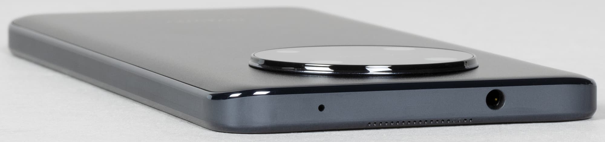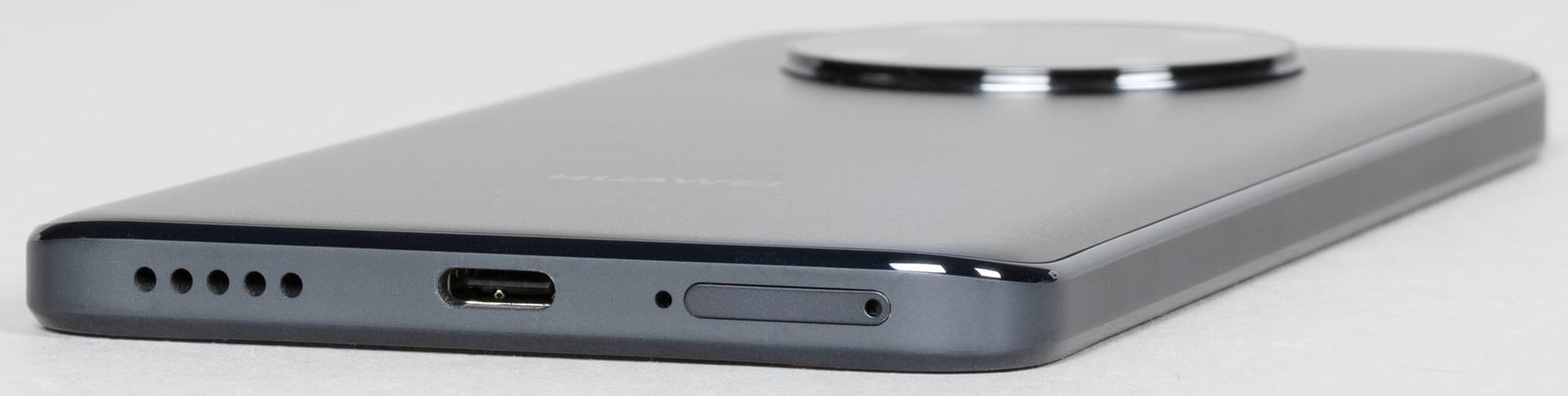 Нижний торец содержит монофонический динамик, микрофон и разъем USB Type-C.