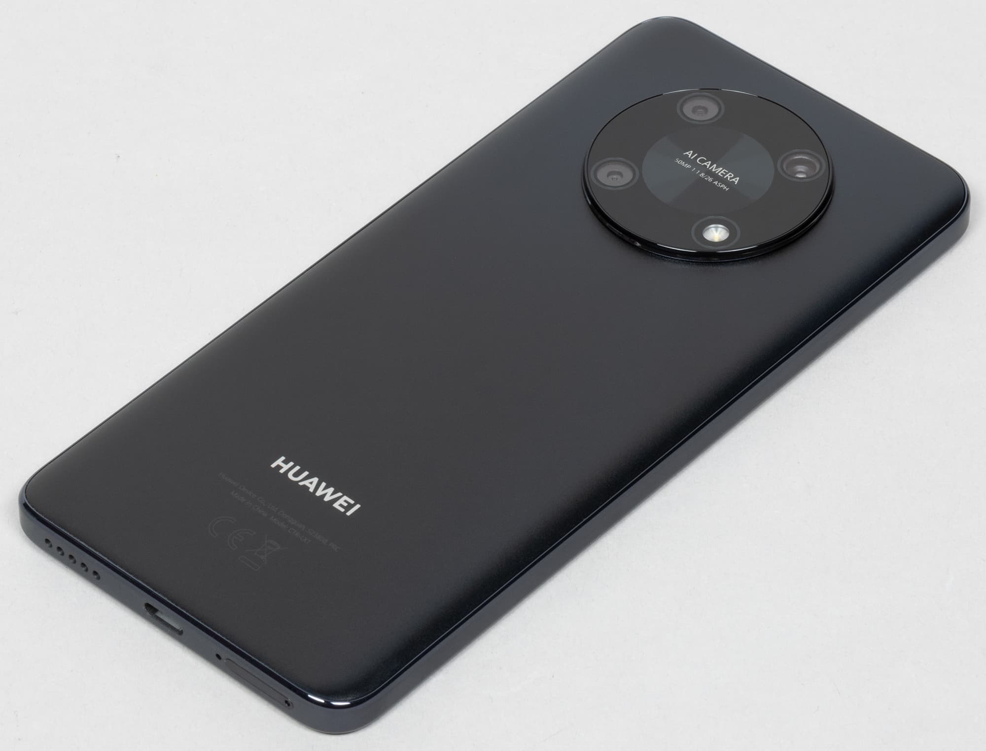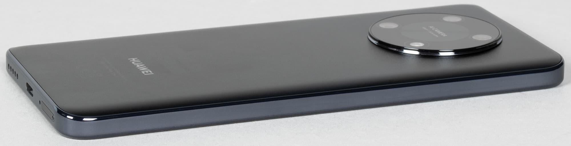 Корпус Huawei Nova Y90 выполнен в довольно скучном дизайне, где глазу зацепиться решительно не за что, кроме огромного выпирающего черного круглого блока с камерами. Но он изящества и без того грубоватому корпусу не добавляет. Понятно, что это отголосок флагманского дизайна Mate 40, но шайба — она и есть шайба. Хотя в других цветах, отличных от черного, корпус выглядит немного наряднее.