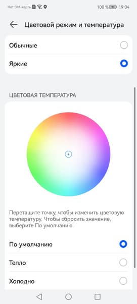 В этом устройстве есть возможность скорректировать цветовой баланс с помощью регулировки оттенка на цветовом круге или просто выбором одного из трех предустановленных профилей.