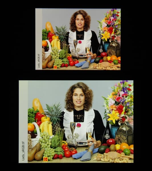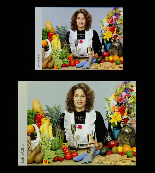 Спектры компонент достаточно хорошо разделены, что и обуславливает широкий цветовой охват. Для потребительского устройства широкий цветовой охват является недостатком, поскольку в итоге цвета изображений — рисунков, фотографий и фильмов, — ориентированных на пространство sRGB (а таких подавляющее большинство), имеют неестественную насыщенность. Особенно это заметно на узнаваемых оттенках, например на оттенках кожи. Результат приведен на фотографиях выше. Впрочем, не все так плохо, при выборе профиля Обычные охват сжимается до границ sRGB: