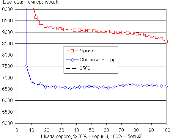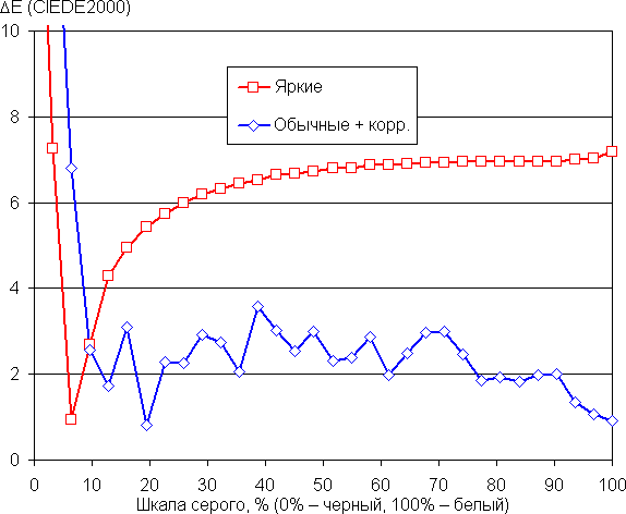 (Самые темные области шкалы серого можно не учитывать, так как там баланс цветов не имеет большого значения, да и погрешность измерений цветовых характеристик на низкой яркости большая.)