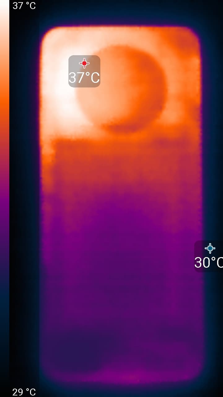 Нагрев больше в верхней части аппарата, что, видимо, соответствует расположению микросхемы SoC. По данным теплокамеры, максимальный нагрев составил 37 градусов (при температуре окружающего воздуха в 24 градуса), это не очень много.