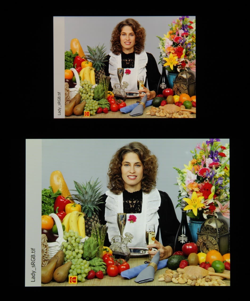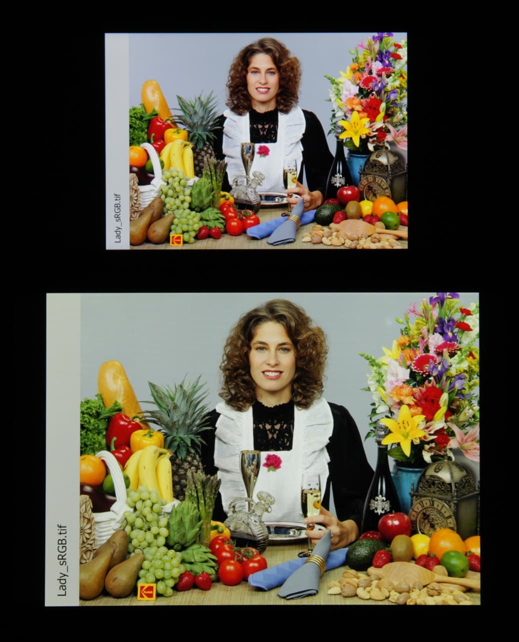 Спектры компонент достаточно хорошо разделены, что и обуславливает широкий цветовой охват. Для потребительского устройства широкий цветовой охват является никак не достоинством, а существенным недостатком, поскольку в итоге цвета изображений — рисунков, фотографий и фильмов, — ориентированных на пространство sRGB (а таких подавляющее большинство), имеют неестественную насыщенность. Особенно это заметно на узнаваемых оттенках, например на оттенках кожи. Результат приведен на фотографиях выше.