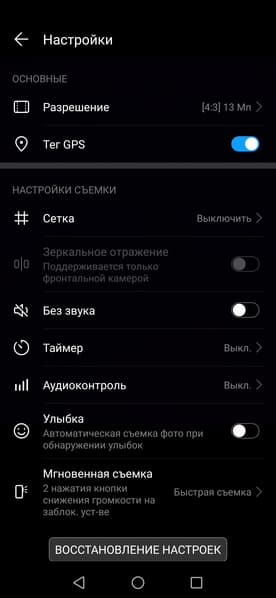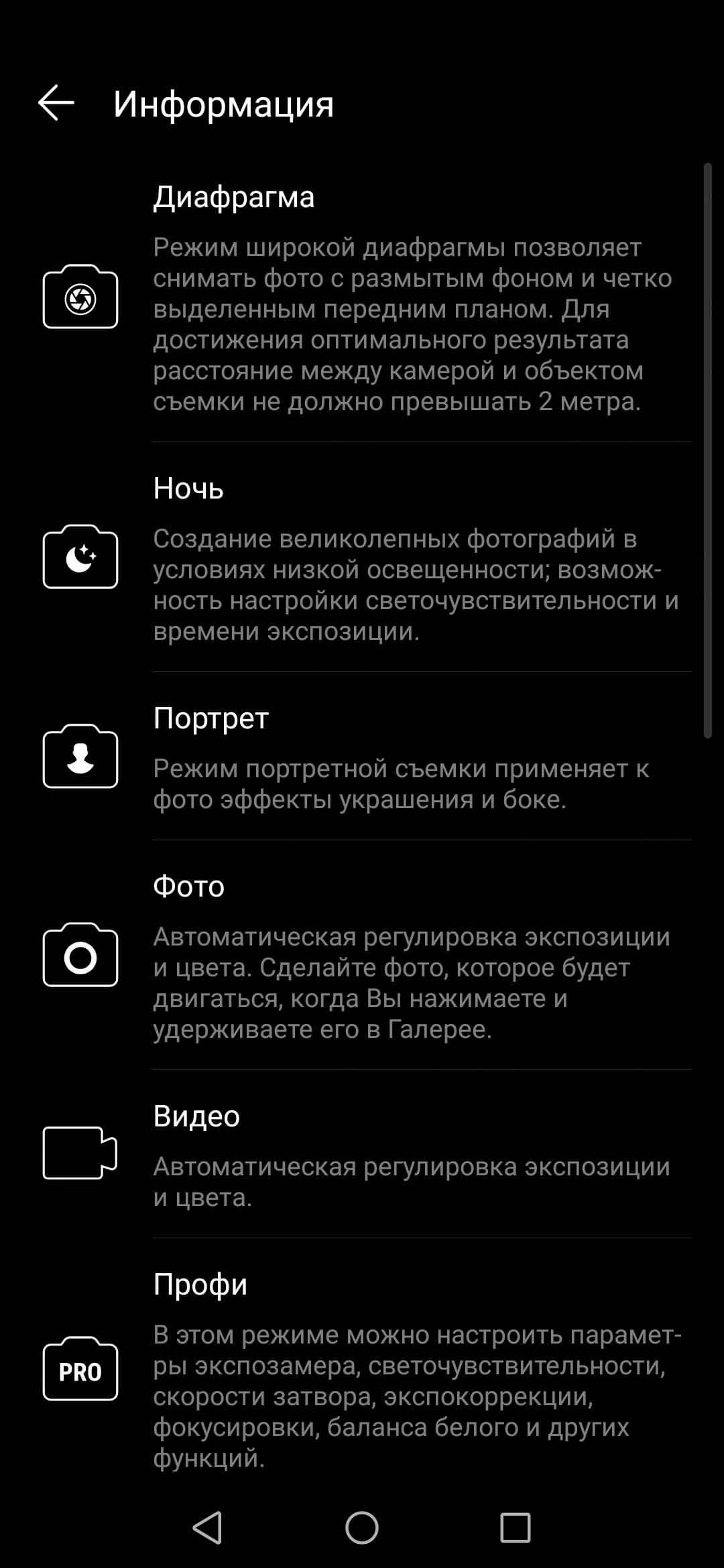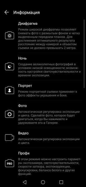 Работа камеры управляется ИИ, который в реальном времени идентифицирует более 500 видов сцен в 22 категориях, устанавливая оптимальные, по мнению автоматики, параметры съемки. Как обычно, есть несколько отдельных режимов, но их тут меньше, чем обычно: есть ночной и портретный, но нет монохромного. В ночном режиме, как и у старших моделей смартфонов Huawei, камера моделирует режим длительной выдержки в 4 секунды, склеивая несколько снимков в один. Штатной возможности сохранять снимки в RAW нет даже в ручном режиме.