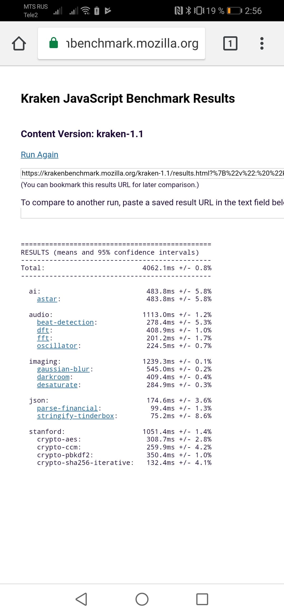 | Mozilla Kraken (мс, меньше — лучше) | 4062 | 5220 | 3837 | 4582 | 4561 |
