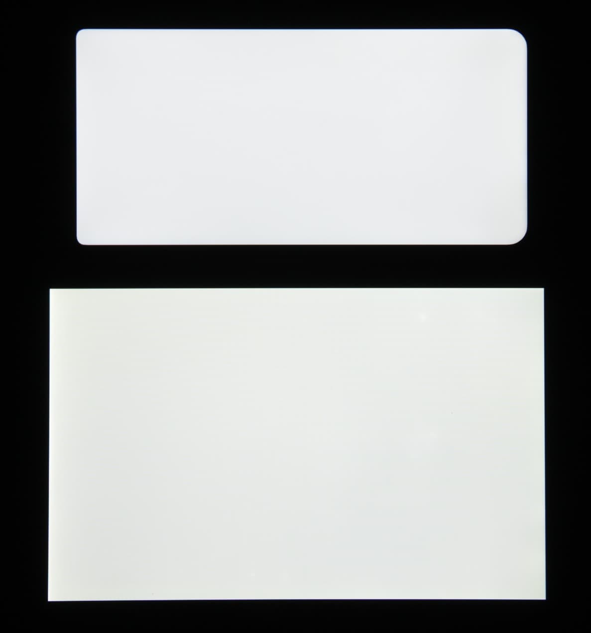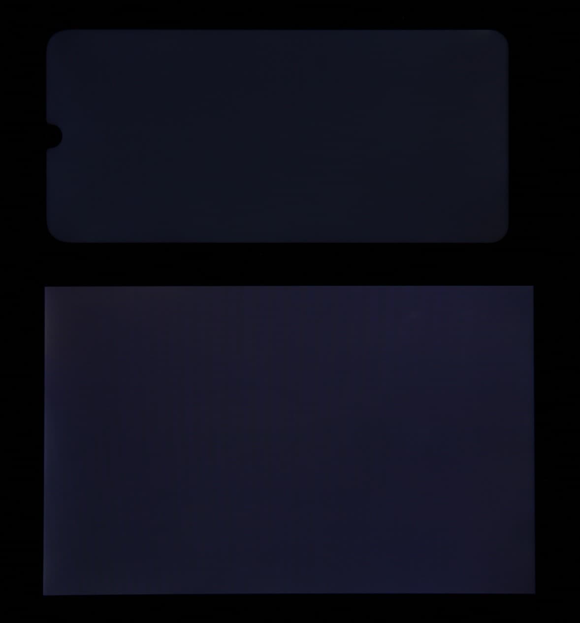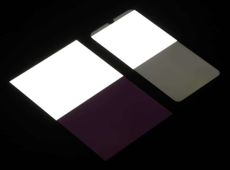 Яркость под углом у экранов уменьшилась (примерно в 5 раз, исходя из разницы в выдержке), но у Huawei P Smart 2019 экран все же немного светлее. Черное поле при отклонении по диагонали высветляется сильно и остается условно нейтрально-серным. Фотографии ниже это демонстрируют (яркость белых участков в перпендикулярном плоскости экранов направлении одинаковая!):