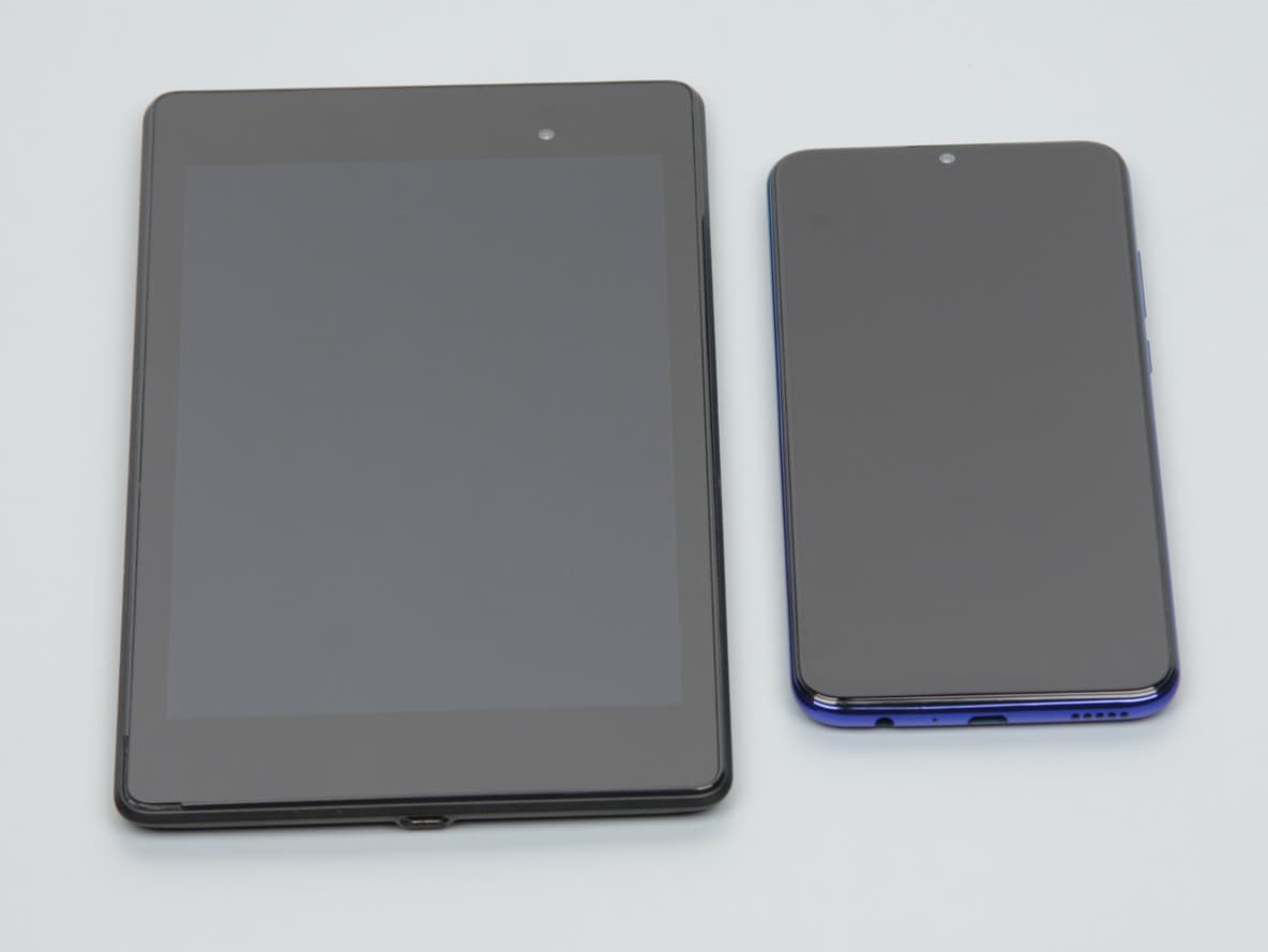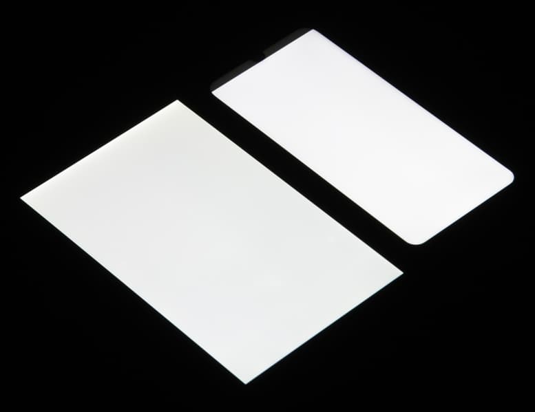 Лицевая поверхность экрана выполнена в виде стеклянной пластины с зеркально-гладкой поверхностью, устойчивой к появлению царапин. Судя по отражению объектов, антибликовые свойства экрана лучше, чем у экрана Google Nexus 7 (2013) (далее просто Nexus 7). Для наглядности приведем фотографию, на которой в выключенных экранах отражается белая поверхность (слева — Nexus 7, справа — Huawei P Smart 2019, далее их можно различать по размеру):