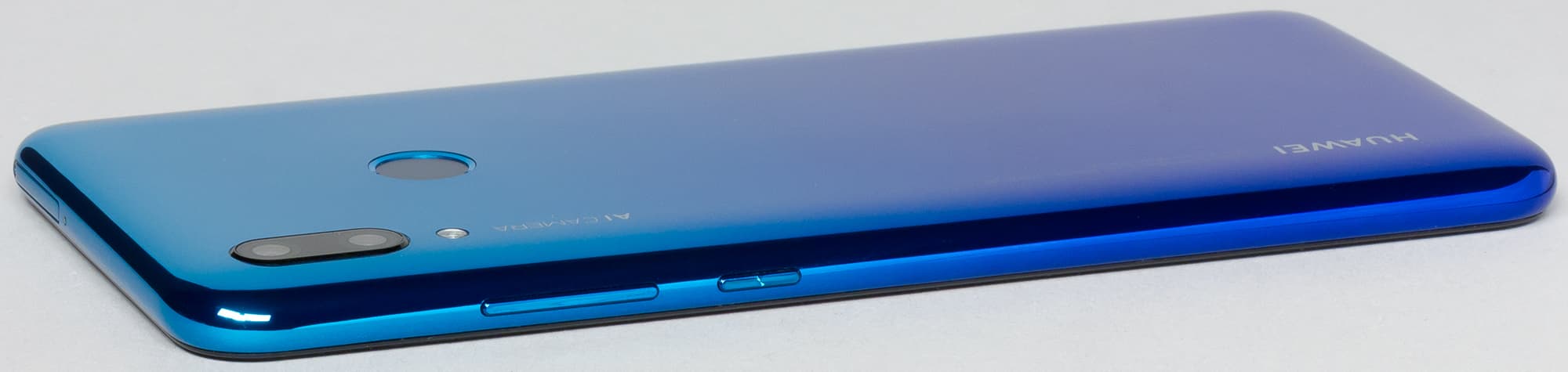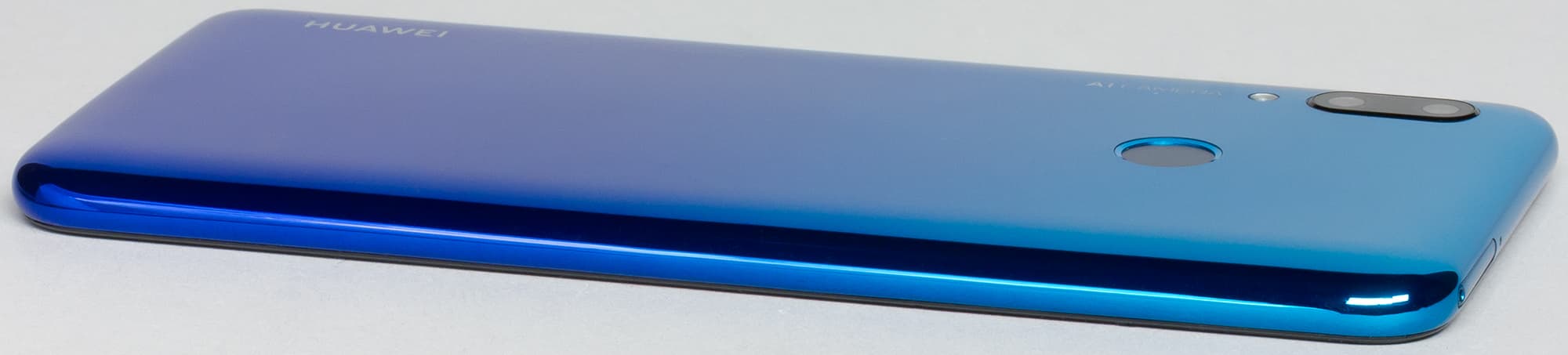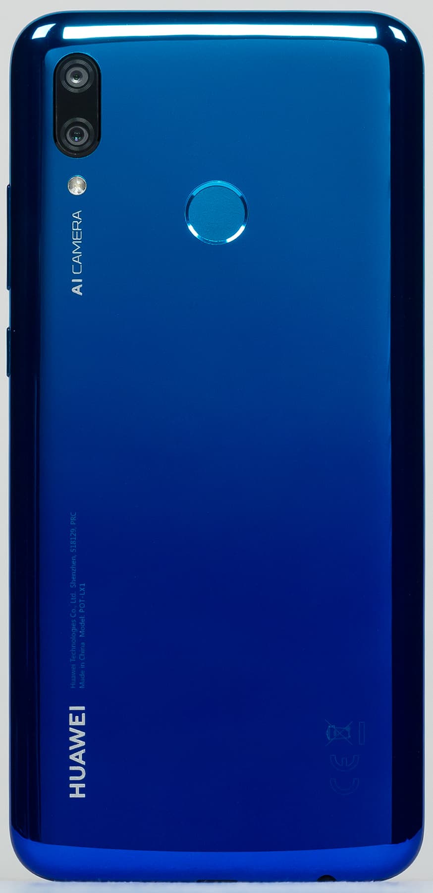 Huawei P Smart 2019 предлагается в двух вариантах расцветки корпуса: «Полночный черный» (Midnight Black) и «Ярко-голубой» (Aurora Blue). Голубой вариант имеет градиентный переход цвета, а черный окрас сплошной. Защиты от пыли и влаги смартфон не получил.