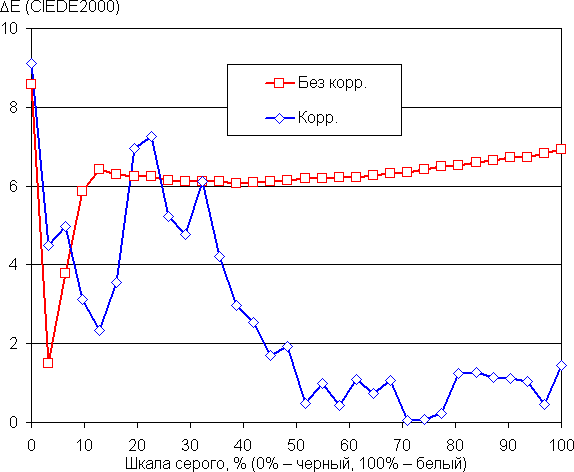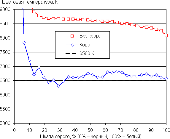 Баланс оттенков на шкале компромиссный, так как цветовая температура существенно выше стандартных 6500 К, но отклонение от спектра абсолютно черного тела (ΔE) ниже 10, что для потребительского устройства считается приемлемым показателем. При этом цветовая температура и ΔE мало изменяются от оттенка к оттенку — это положительно сказывается на визуальной оценке цветового баланса. (Самые темные области шкалы серого можно не учитывать, так как там баланс цветов не имеет большого значения, да и погрешность измерений цветовых характеристик на низкой яркости большая.)