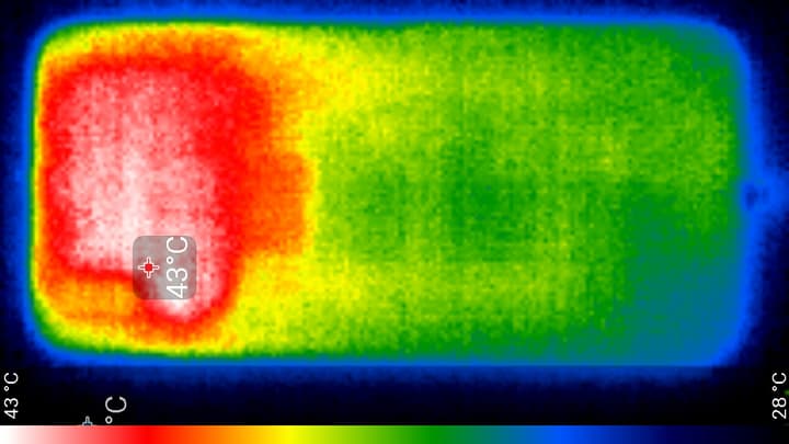 Нагрев локализован в верхней части аппарата, что, видимо, соответствует расположению микросхемы SoC. По данным теплокамеры, максимальный нагрев составил 43 градуса (при температуре окружающего воздуха в 24 градуса), это несколько выше среднего значения в данном тесте для современных смартфонов.