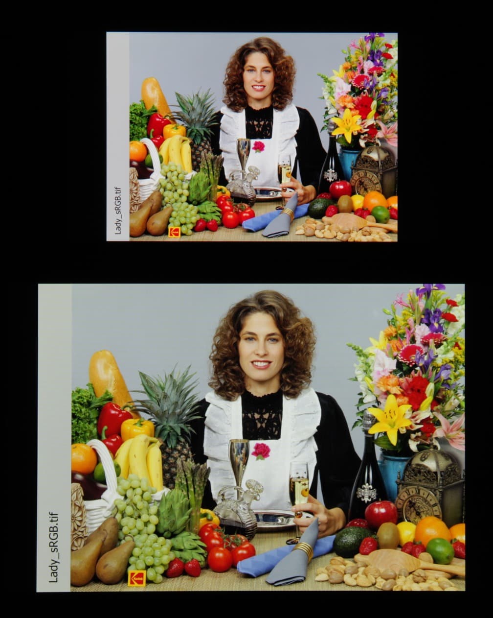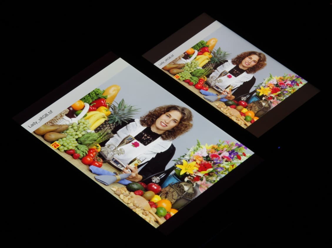 Такое мы уже видели в случае, например, Sony Xperia Z2 и других мобильных устройств. Sony указывает, что в этих экранах используются светодиоды с синим излучателем и зеленым и красным люминофором (обычно — синий излучатель и желтый люминофор), что в сочетании со специальными светофильтрами матрицы и позволяет получить широкий цветовой охват. Да, и в красном люминофоре, видимо, используются так называемые квантовые точки. Для потребительского устройства широкий цветовой охват является никак не достоинством, а существенным недостатком, поскольку в итоге цвета изображений — рисунков, фотографий и фильмов, — ориентированных на пространство sRGB (а таких подавляющее большинство), имеют неестественную насыщенность. Особенно это заметно на узнаваемых оттенках, например на оттенках кожи. Результат приведен на фотографии выше.