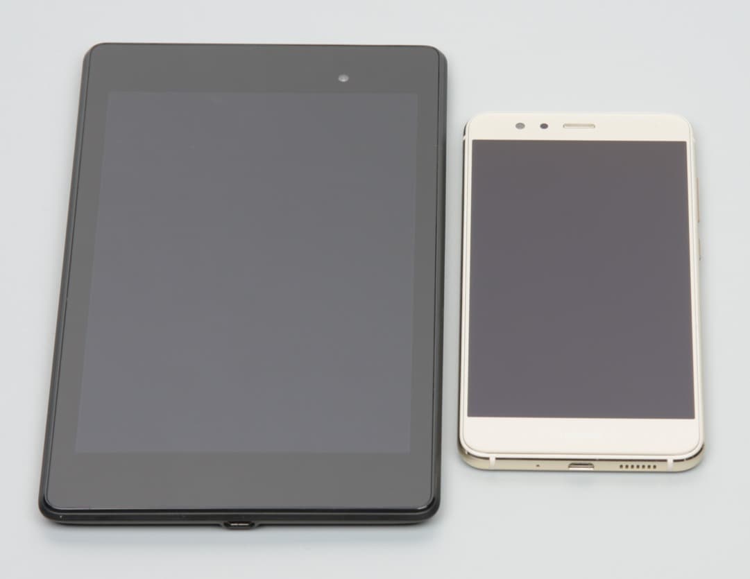 Лицевая поверхность экрана выполнена в виде стеклянной пластины с зеркально-гладкой поверхностью, устойчивой к появлению царапин. Судя по отражению объектов антибликовые свойства экрана лучше, чем у экрана Google Nexus 7 (2013) (далее просто Nexus 7). Для наглядности приведем фотографию, на которой в выключенных экранах отражается белая поверхность (слева — Nexus 7, справа — Huawei P10 lite, далее их можно различать по размеру):