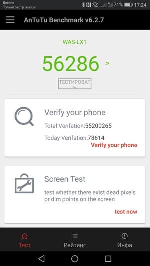 | AnTuTu (v6.x) (больше — лучше) | 56286 | 57038 | 50597 | 45579 | 63146 |