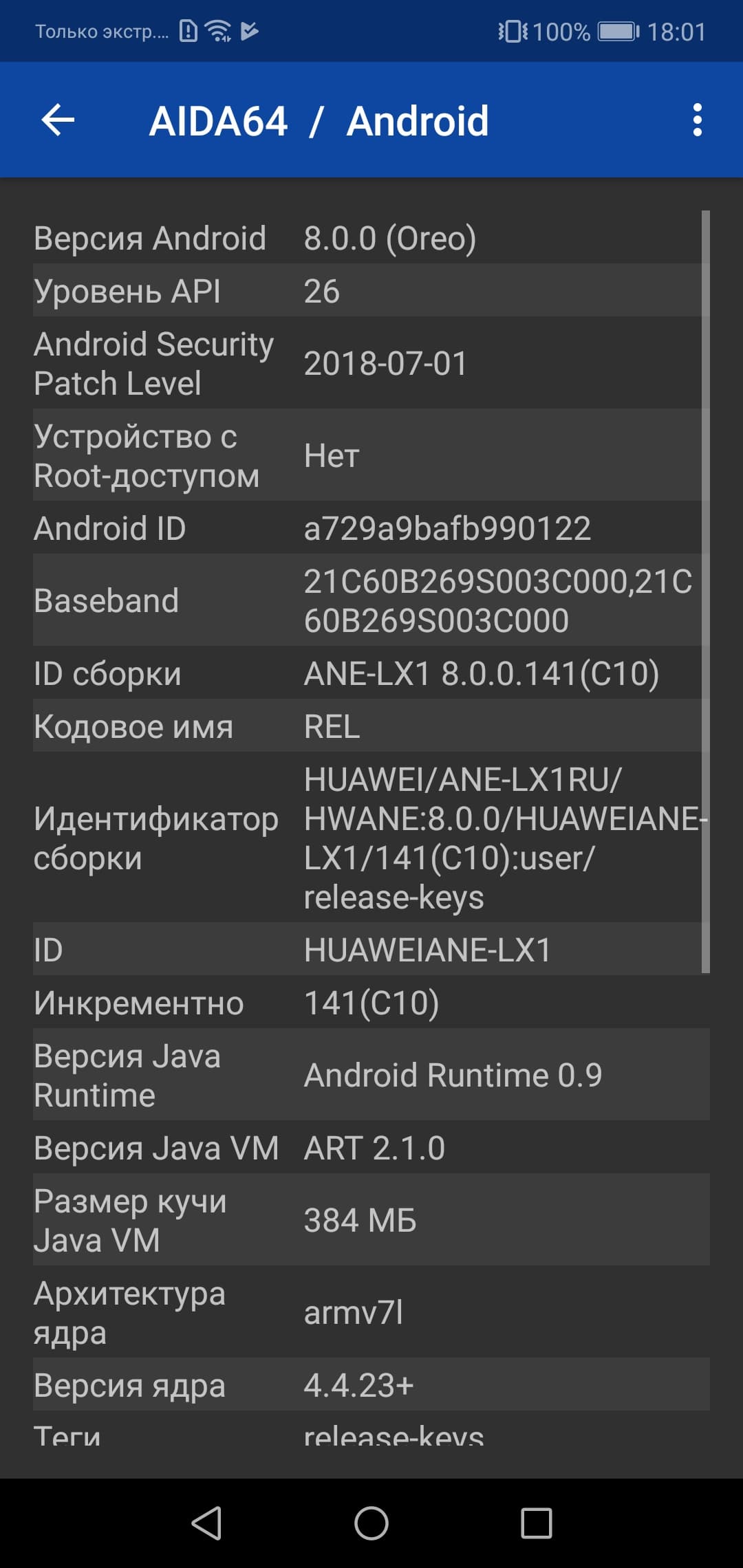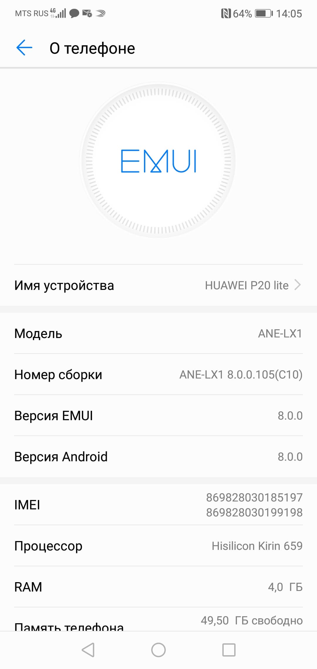 - Операционная система Android 8.0, EMUI 8