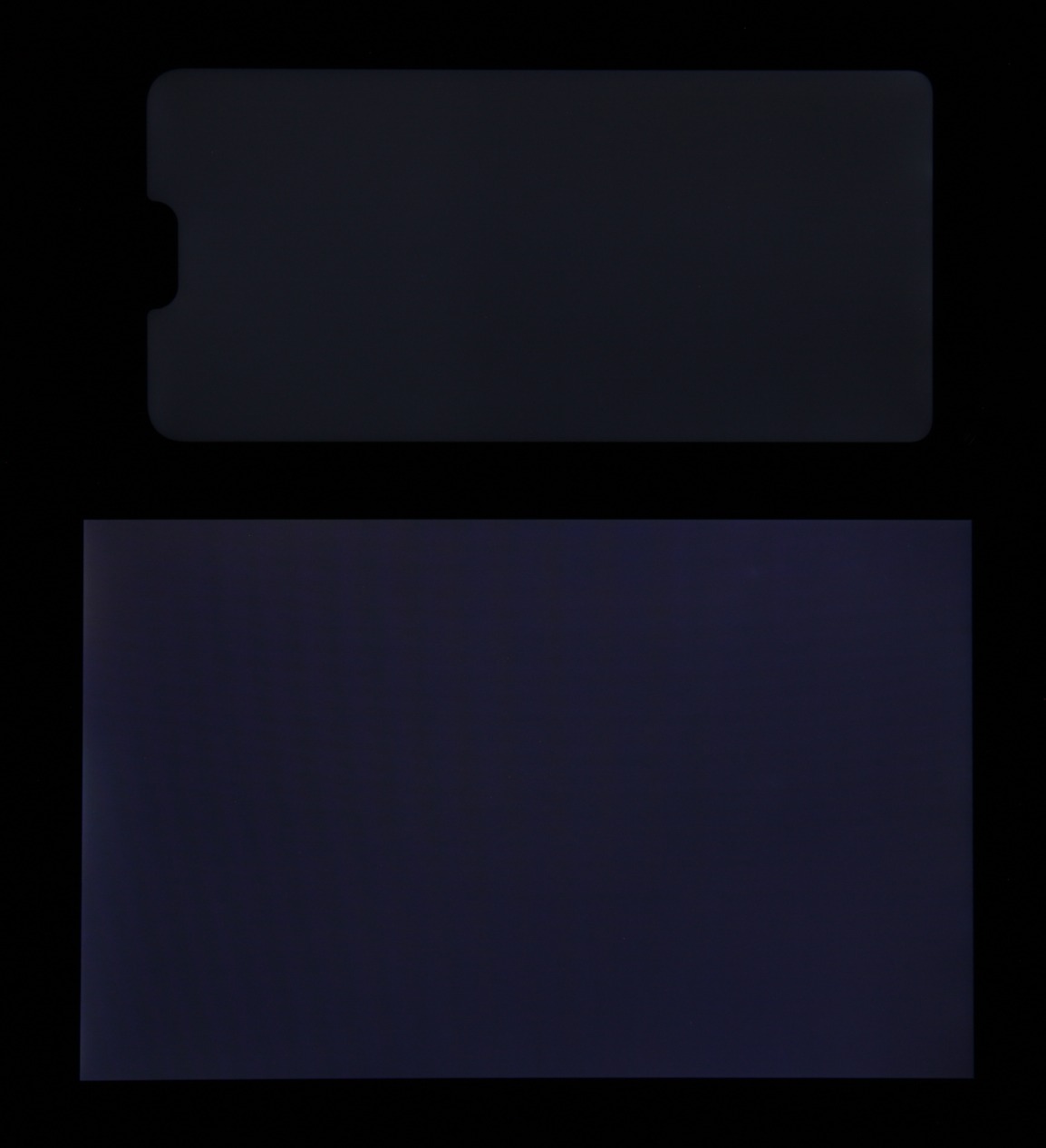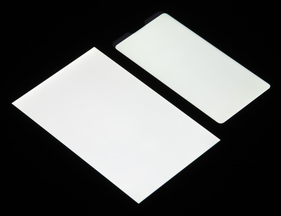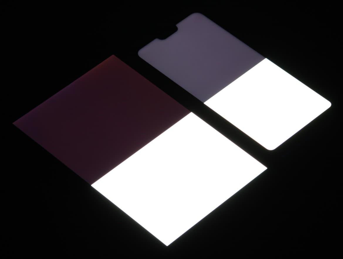Яркость под углом у экранов уменьшилась (как минимум в 5 раз, исходя из разницы в выдержке), но у Huawei P20 Lite экран все же немного темнее. Черное поле при отклонении по диагонали высветляется сильно и приобретает фиолетовый оттенок. Фотографии ниже это демонстрируют (яркость белых участков в перпендикулярном плоскости экранов направлении одинаковая!):