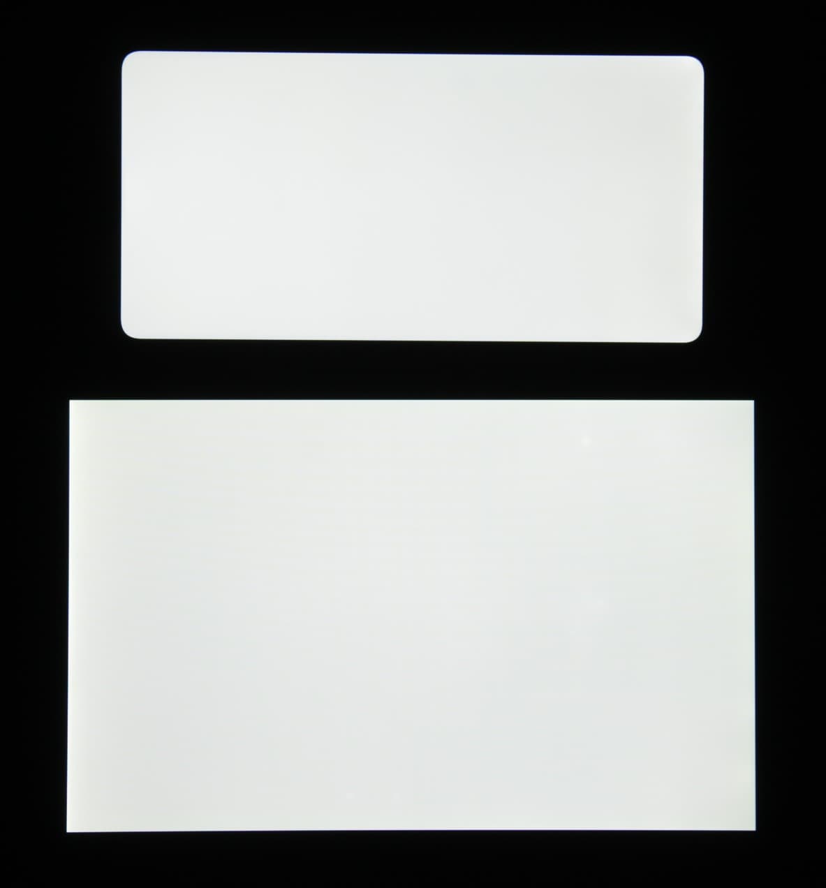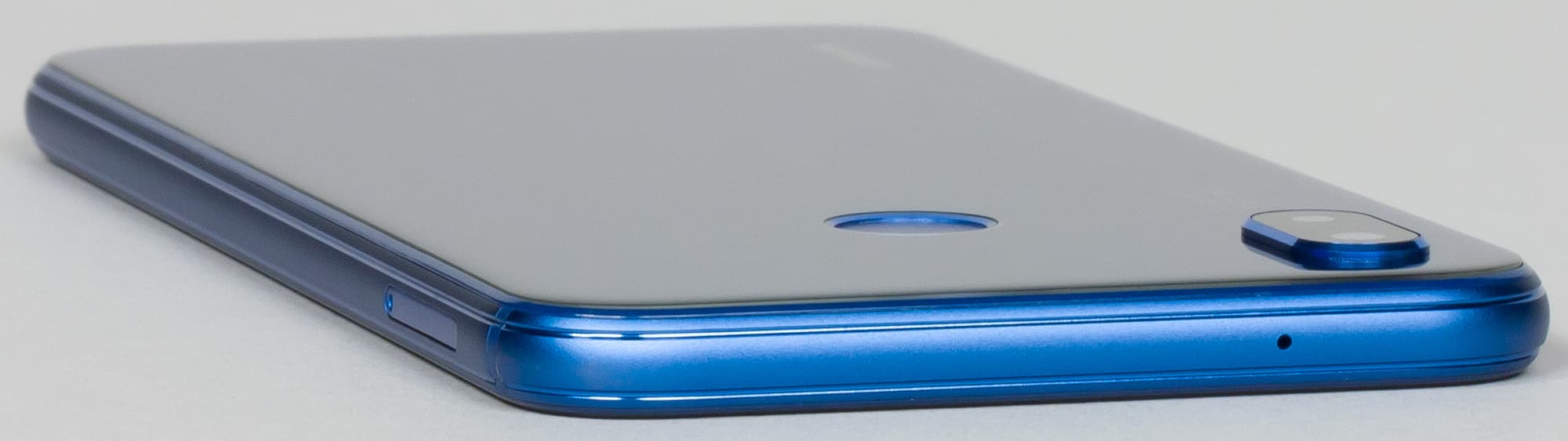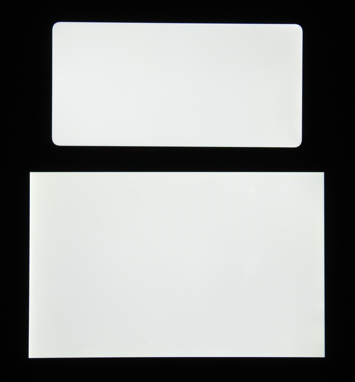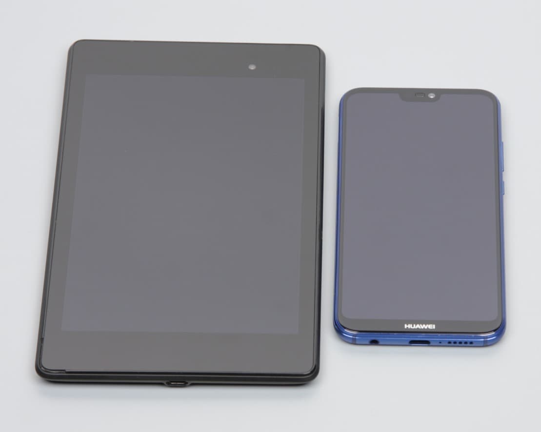 Лицевая поверхность экрана выполнена в виде стеклянной пластины с зеркально-гладкой поверхностью, устойчивой к появлению царапин. Судя по отражению объектов, антибликовые свойства экрана примерно такие же, как у экрана Google Nexus 7 (2013) (далее просто Nexus 7). Для наглядности приведем фотографию, на которой в выключенных экранах отражается белая поверхность (слева — Nexus 7, справа — Huawei P20 Lite, далее их можно различать по размеру):