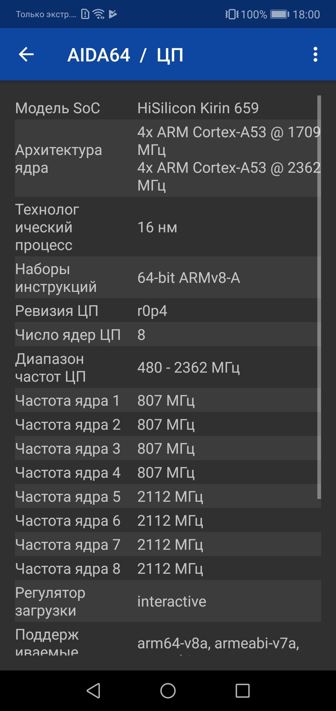 - SoC HiSilicon Kirin 659, 8 ядер Cortex-A53 (4@2,36 ГГц + 4@1,7 ГГц)
