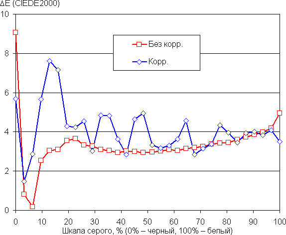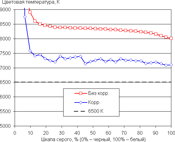 Баланс оттенков на шкале компромиссный, так как цветовая температура существенно выше стандартных 6500 К, но отклонение от спектра абсолютно черного тела (ΔE) ниже 10, что для потребительского устройства считается приемлемым показателем. При этом цветовая температура и ΔE мало изменяются от оттенка к оттенку — это положительно сказывается на визуальной оценке цветового баланса. (Самые темные области шкалы серого можно не учитывать, так как там баланс цветов не имеет большого значения, да и погрешность измерений цветовых характеристик на низкой яркости большая.)