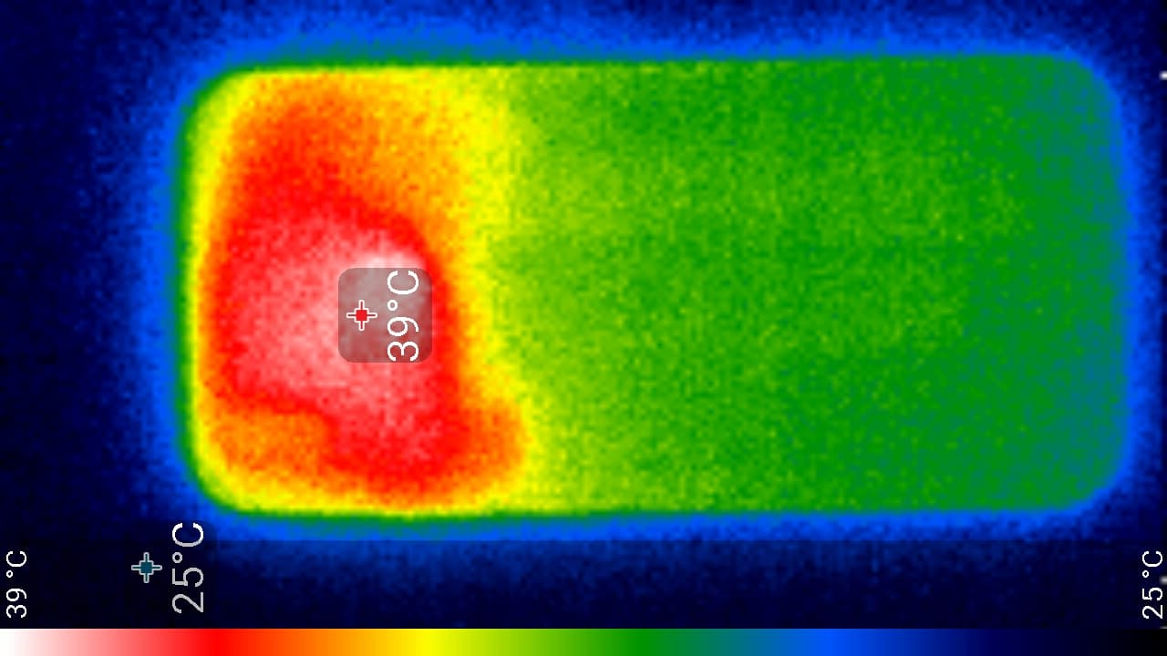 Нагрев больше локализован в верхней части аппарата, что, видимо, соответствует расположению микросхемы SoC. По данным теплокамеры, максимальный нагрев составил 39 градусов (при температуре окружающего воздуха в 24 градуса), это средний нагрев в данном тесте для современных смартфонов