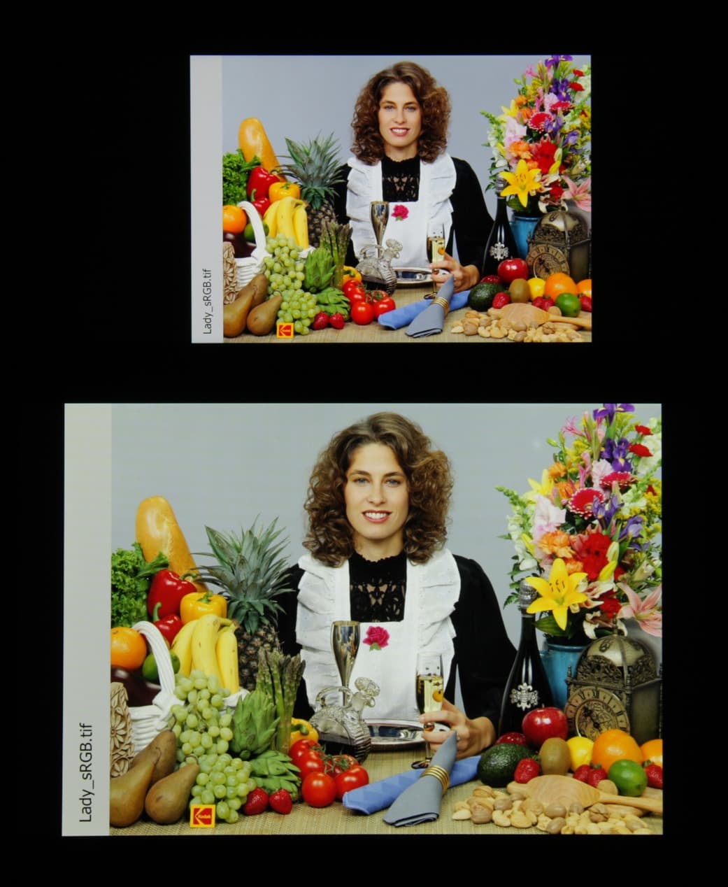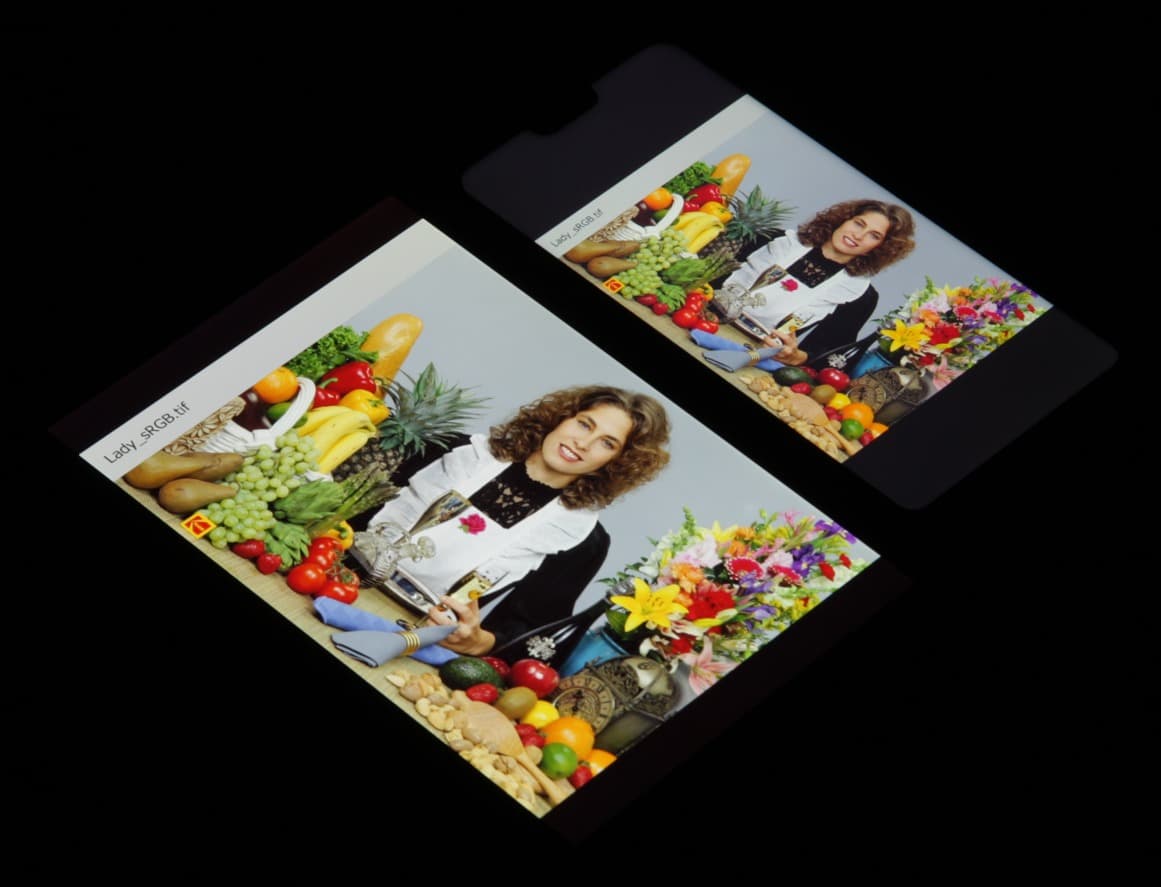 Спектры компонент хорошо разделены, что и обуславливает широкий цветовой охват. Для потребительского устройства широкий цветовой охват является никак не достоинством, а существенным недостатком, поскольку в итоге цвета изображений — рисунков, фотографий и фильмов, — ориентированных на пространство sRGB (а таких подавляющее большинство), имеют неестественную насыщенность. Особенно это заметно на узнаваемых оттенках, например на оттенках кожи. Результат приведен на фотографиях выше.