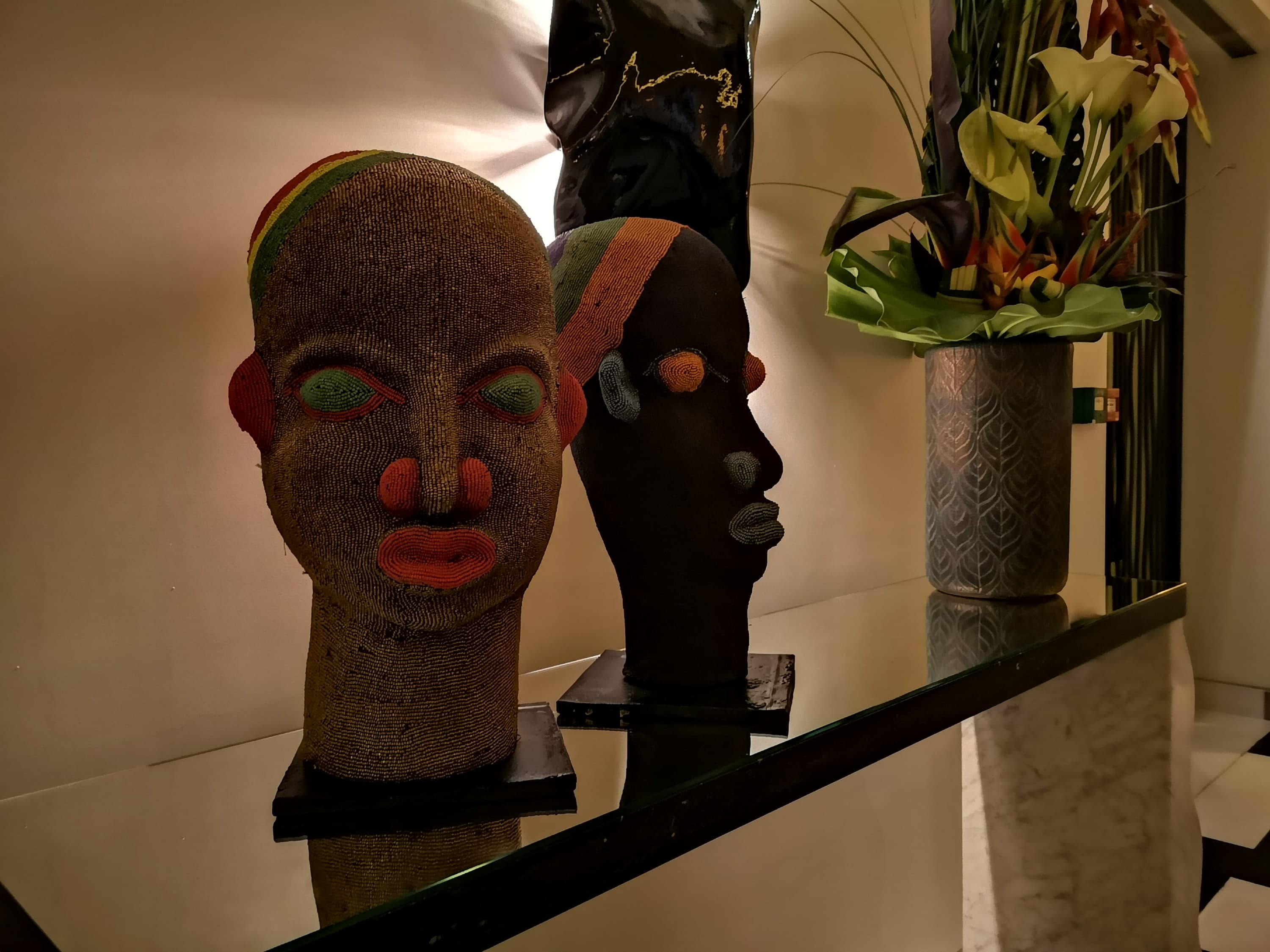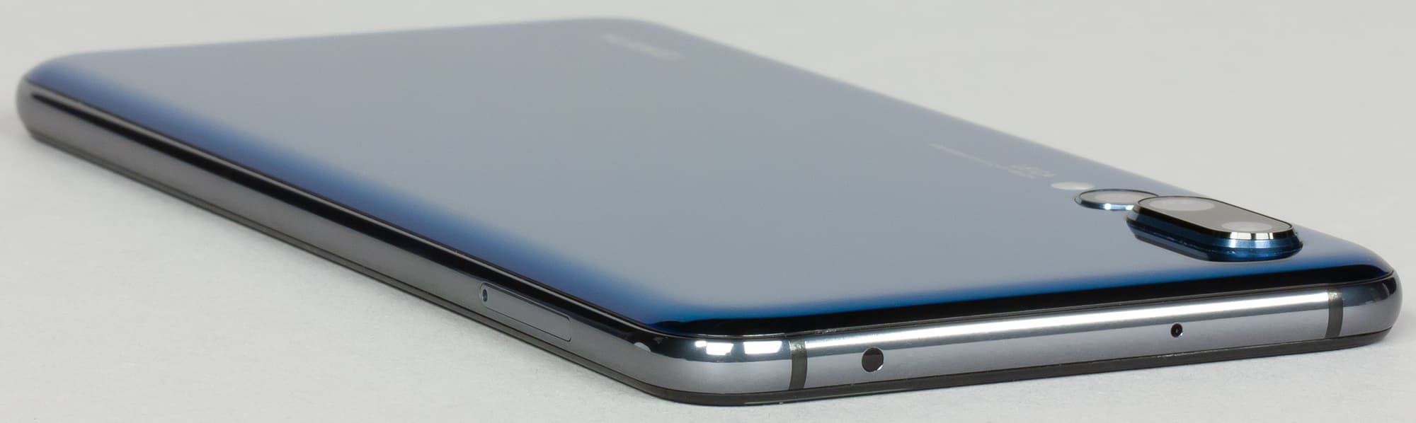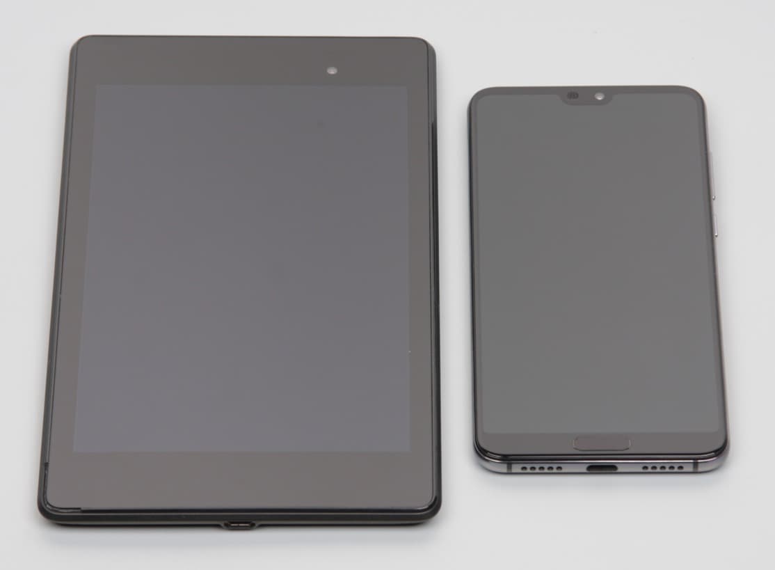 Лицевая поверхность экрана выполнена в виде стеклянной пластины с зеркально-гладкой поверхностью, устойчивой к появлению царапин. Судя по отражению объектов, антибликовые свойства экрана не хуже, чем у экрана Google Nexus 7 (2013) (далее просто Nexus 7). Для наглядности приведем фотографию, на которой в выключенных экранах отражается белая поверхность (слева — Nexus 7, справа — Huawei P20 Pro, далее их можно различать по размеру):