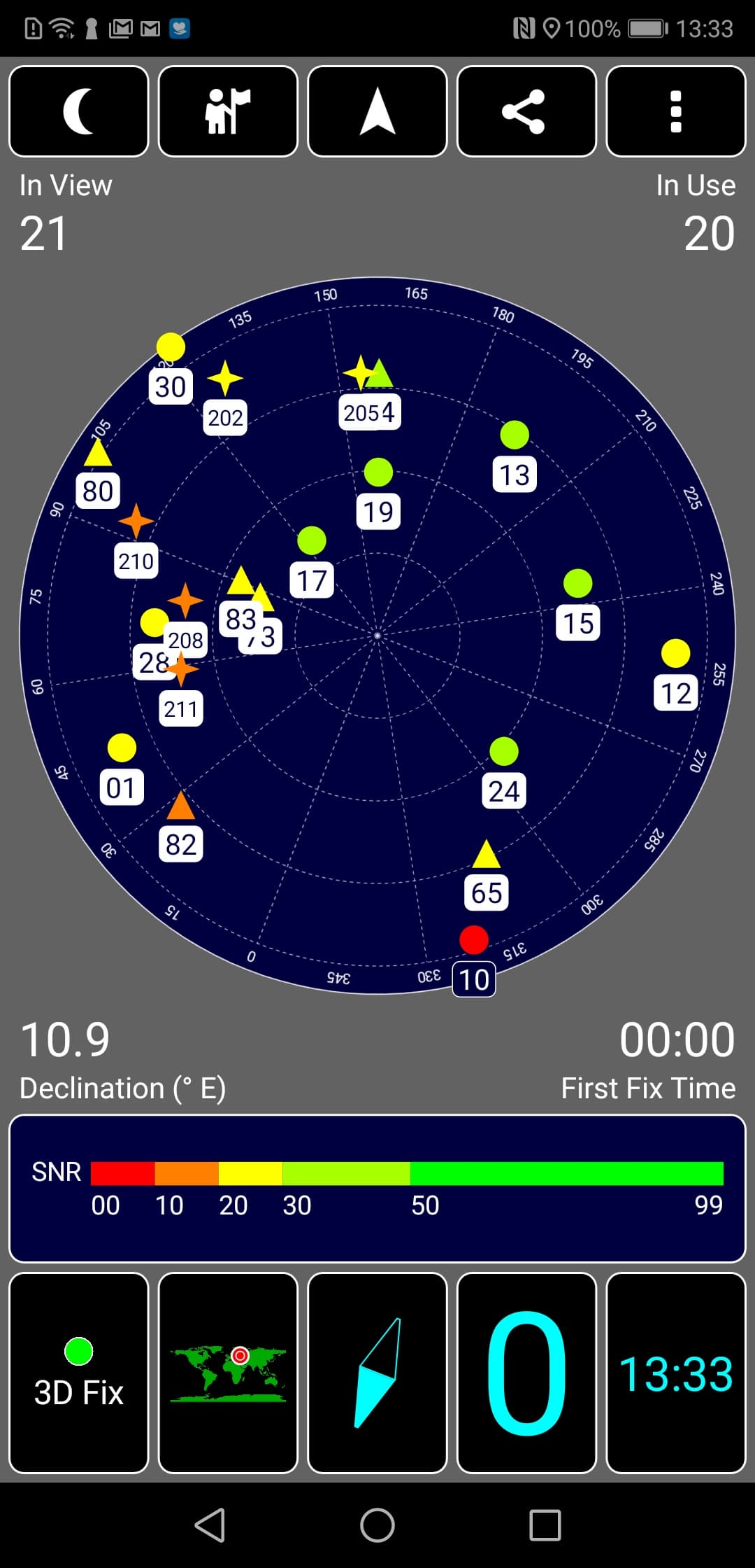 Навигационный модуль работает и с GPS (с A-GPS), и с отечественной Глонасс, и с китайской Beidou. Первые спутники даже при холодном старте обнаруживаются быстро, в течение первых же секунд, точность позиционирования не вызывает претензий. Магнитный компас, необходимый для навигационных программ, также на месте.