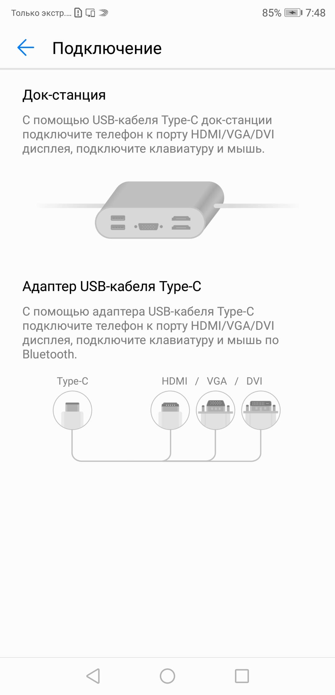 Подробности описаны в статье про Huawei P20. Дополнительно мы протестировали работу Huawei P20 Pro с адаптером Tronsmart CTHA1, оснащенным проходным разъемом USB Type-C с поддержкой USB Power Delivery, выходом HDMI, картоводом для карт SD и microSD, а также двумя портами USB 3.0.
