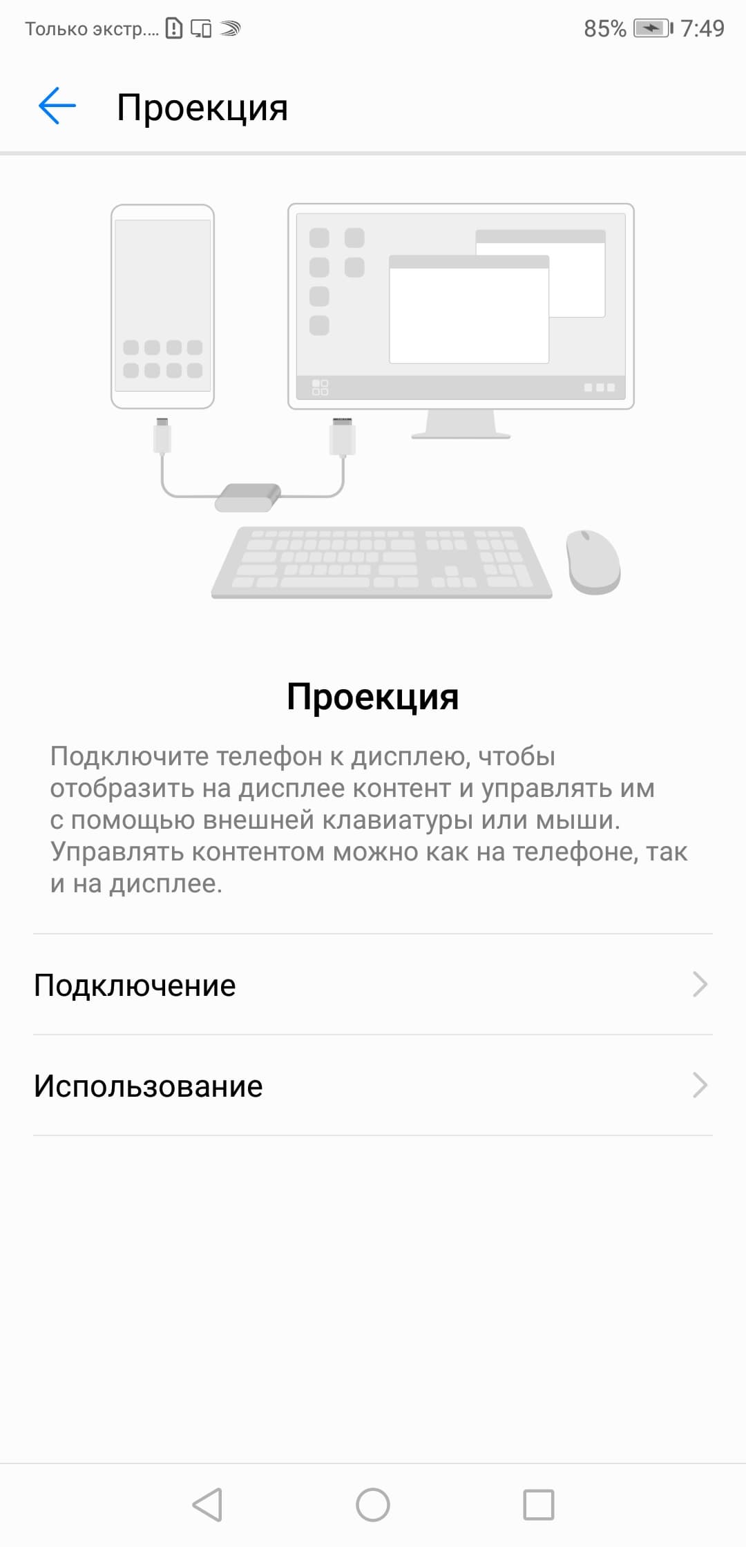 Данный аппарат поддерживает DisplayPort Alt Mode для USB Type-C — вывод изображения и звука на внешнее устройство при подключении к порту USB. Работу в таком режиме мы опробовали совместно с адаптером USB Type-C → HDMI (компании Choetech). Вывод видео осуществляется в режиме 1080p при 60 Гц кадровой частоты. Режимов работы два: простое копирование экрана смартфона или вывод второго (в дополнение к экрану смартфона) рабочего стола.