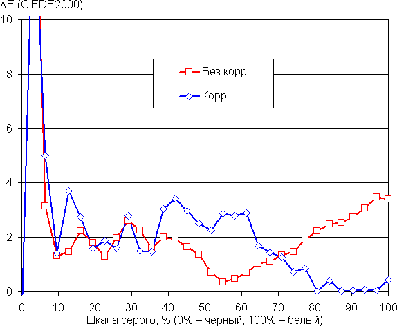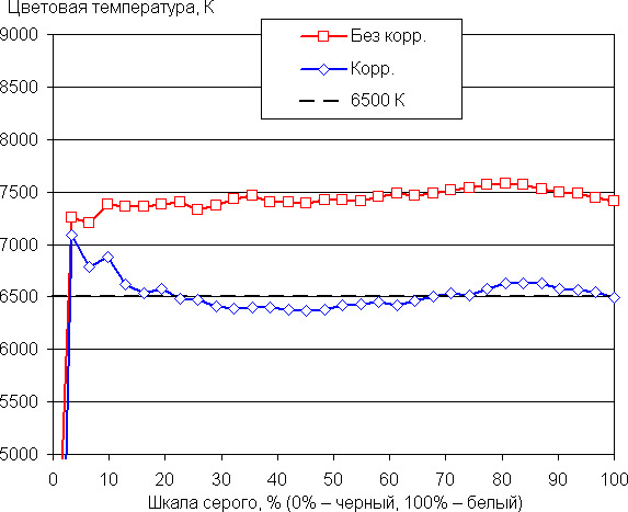 В случае профиля Цвета → Яркие баланс оттенков на шкале серого приемлемый, так как цветовая температура заметно выше стандартных 6500 К, но отклонение от спектра абсолютно черного тела (ΔE) ниже 10 единиц, что для потребительского устройства считается хорошим показателем (данные, подписанные как Без корр. на графиках ниже). При этом вариация цветовой температуры и ΔE не очень большая — это положительно сказывается на визуальной оценке цветового баланса. (Темные области шкалы серого можно не учитывать, так как там баланс цветов не имеет большого значения, да и погрешность измерений цветовых характеристик на низкой яркости большая.)