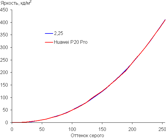 Построенная по 32 точкам с равным интервалом по численному значению оттенка серого гамма-кривая показала, что существенного завала нет ни в светах, ни в тенях. Показатель аппроксимирующей степенной функции равен 2,25, что чуть больше стандартного значения 2,2, при этом реальная гамма-кривая почти не отклоняется от степенной зависимости:
