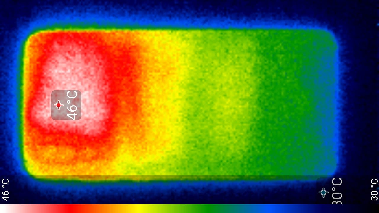 Нагрев локализован выше центра, что, видимо, соответствует расположению микросхемы SoC. По данным теплокамеры, максимальный нагрев составил 46 градусов (при температуре окружающего воздуха в 24 градуса), это существенно выше среднего значения в данном тесте для современных смартфонов.