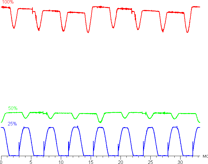 Видно, что на максимальной и средней яркости амплитуда модуляции не очень большая, в итоге видимого мерцания нет. Однако на пониженной яркости появляется модуляция с большой относительной амплитудой, ее наличие уже можно увидеть в тесте на присутствие стробоскопического эффекта или просто при быстром движении глаз. В зависимости от индивидуальной чувствительности такое мерцание может вызывать повышенную утомляемость.
