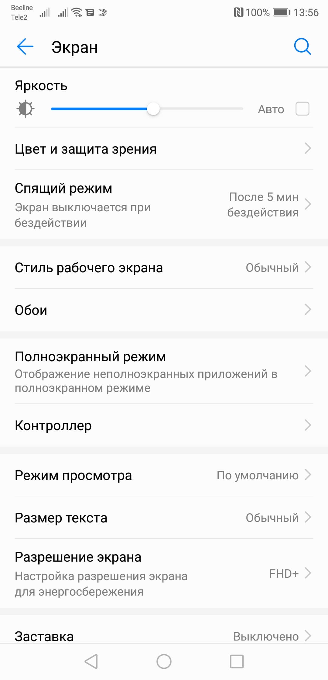 При выводе белого поля во весь экран и при ручном управлении яркостью ее максимальное значение составило 410 кд/м² в обычных условиях, на очень ярком свету оно повышается до 580 кд/м². В данном случае чем меньше площадь белого на экране, тем он светлее, то есть фактическая максимальная яркость белых участков будет почти всегда выше указанных значений. В итоге читаемость экрана днем на солнце должна быть на хорошем уровне. Минимальное значение яркости — 2,4 кд/м², то есть пониженный уровень яркости без проблем позволяет использовать устройство даже в полной темноте. Работает автоматическая регулировка яркости по датчику освещенности (он расположен по центру выреза в экране). Работа этой функции зависит от положения ползунка регулировки яркости, им пользователь может попытаться выставить желаемый уровень яркости в текущих условиях. Если выставить ползунок на примерно 50% в условиях офиса, то в полной темноте функция автояркости уменьшает яркость до 6 кд/м² (темновато), в условиях освещенного искусственным светом офиса (примерно 550 лк) устанавливает на 220 кд/м² (нормально), в очень ярком окружении (соответствует освещению ясным днем вне помещения, но без прямого солнечного света — 20000 лк или немного больше) повышает до 580 кд/м² (до максимума, так и нужно). Результат нас не совсем устроил, поэтому в полной темноте мы чуть увеличили яркость, получив в итоге для трех условий, указанных выше, следующие значения: 20, 180-230, 580 кд/м² (идеальное сочетание). В автоматическом режиме яркость повышается и понижается при переходах от условий полной темноты к освещению в офисе и обратно, но она почему-то не снижается после засветки ярким светом — вернее, снижается, но только после цикла выключения-включения экрана, да и то для отвечающего условиям полной темноты снижения яркости может потребоваться два таких цикла. Получается, что функция автоподстройки яркости работает немного странно, но в целом адекватно и позволяет пользователю настраивать свою работу под индивидуальные требования.