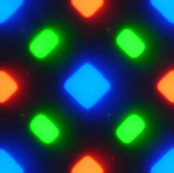 В этом экране используется матрица Super AMOLED — активная матрица на органических светодиодах. Полноцветное изображение создается с помощью субпикселей трех цветов — красного (R), зеленого (G) и синего (B), но красных и синих субпикселей в два раза меньше, что можно обозначить как RGBG. Это подтверждается фрагментом микрофотографии:
