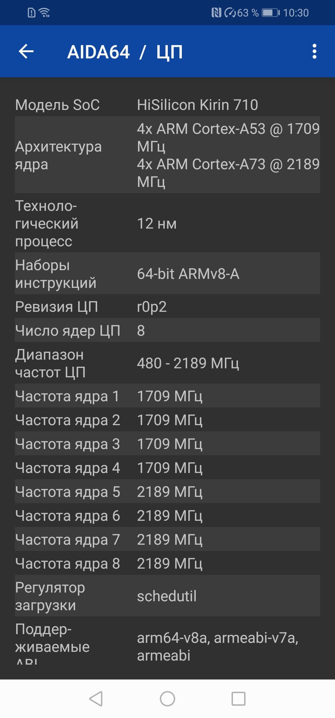 - SoC Kirin 710, 8 ядер: 4×Cortex-A73 @2,2 ГГц + 4×Cortex-A53 @1,7 ГГц