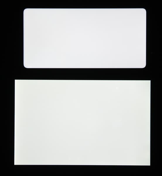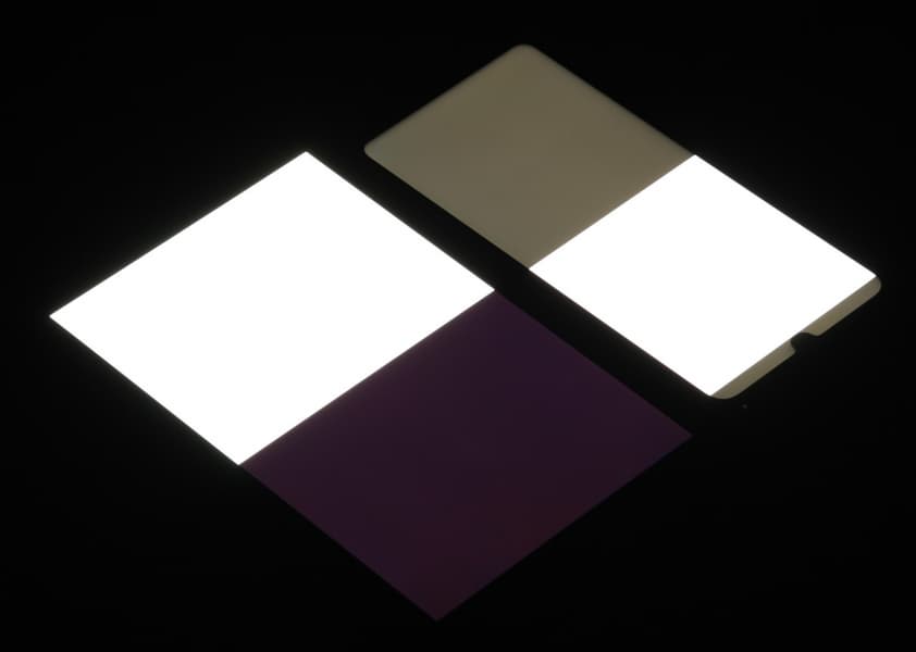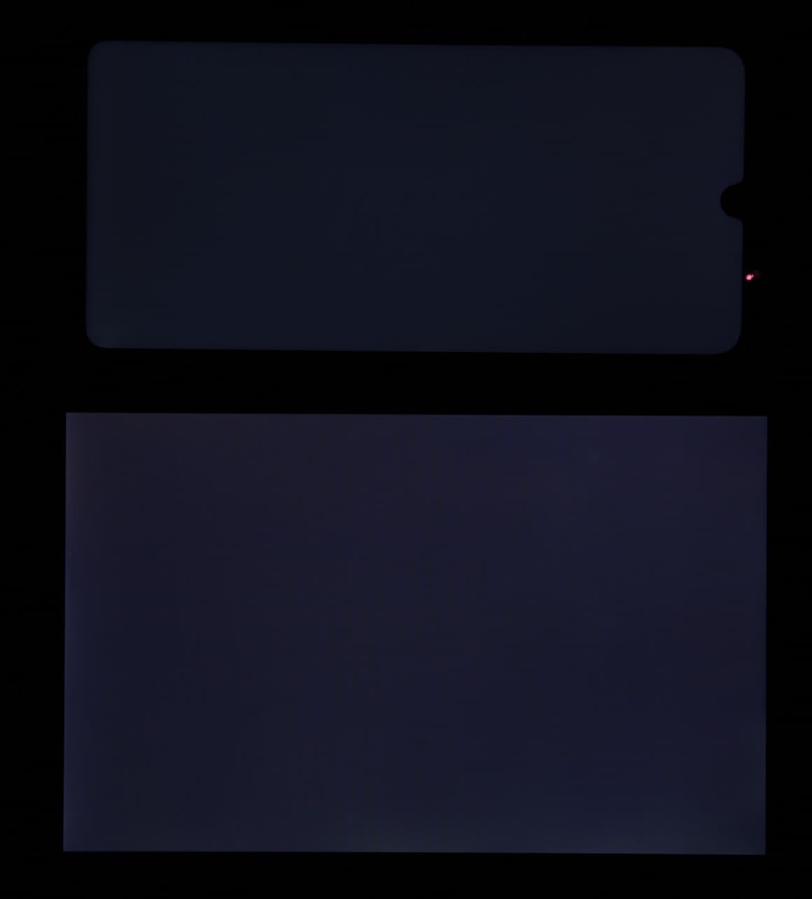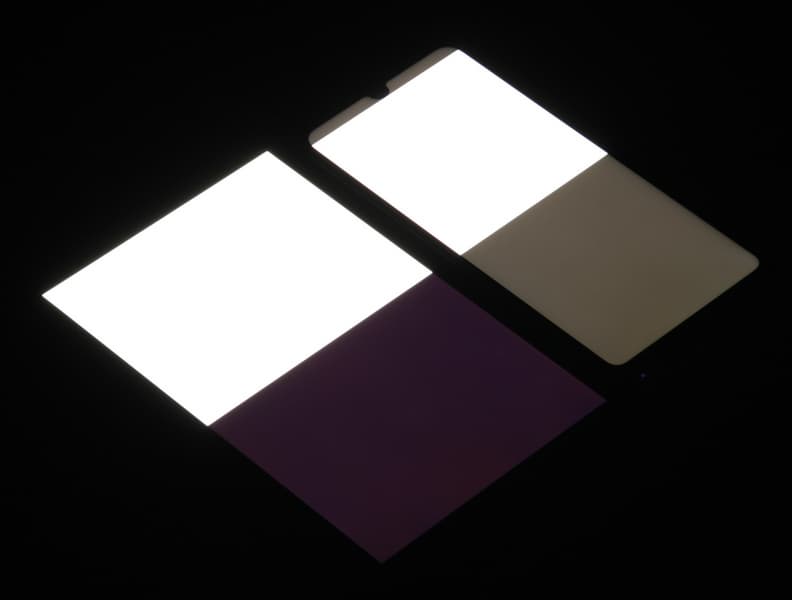 Яркость под углом у экранов уменьшилась (как минимум в 5 раз, исходя из разницы в выдержке), но у Huawei P30 lite экран все же немного темнее. Черное поле при отклонении по диагонали высветляется сильно, но остается условно нейтрально-серым. Фотографии ниже это демонстрируют (яркость белых участков в перпендикулярном плоскости экранов направлении одинаковая!):