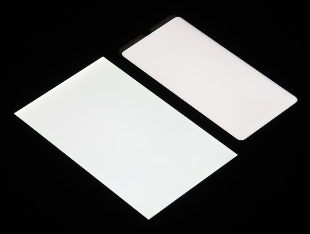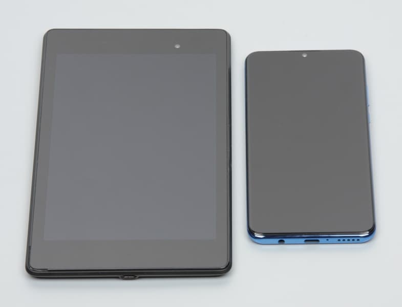 Лицевая поверхность экрана выполнена в виде стеклянной пластины с зеркально-гладкой поверхностью, устойчивой к появлению царапин. Судя по отражению объектов, антибликовые свойства экрана лучше, чем у экрана Google Nexus 7 (2013) (далее просто Nexus 7). Для наглядности приведем фотографию, на которой в выключенных экранах отражается белая поверхность (слева — Nexus 7, справа — Huawei P30 lite, далее их можно различать по размеру):