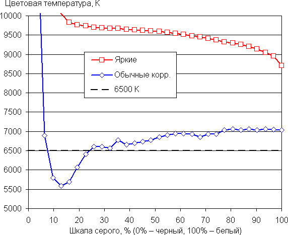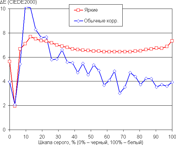 На графиках ниже кривые Яркие соответствуют результатам без какой-либо коррекции цветового баланса (профиль Яркие), а кривые Обычные, корр. — данным, полученным после выбора профиля Обычные и сдвига точки на круге в указанное на снимке выше положение. Видно, что изменение баланса соответствует ожидаемому результату, так как ΔE уменьшилось. Какая-то польза от такой коррекции есть, правда яркость снизилась на 11%. Отметим, что данная функция реализована в варианте скорее для галочки, так как нет численного отражения коррекции и нет специального поля для замера цветового баланса. (Самые темные области шкалы серого можно не учитывать, так как там баланс цветов не имеет большого значения, да и погрешность измерений цветовых характеристик на низкой яркости большая.)