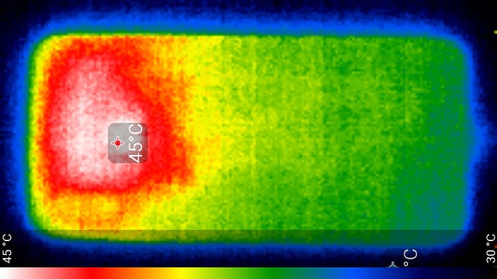 Нагрев больше в верхней части аппарата, что, видимо, соответствует расположению микросхемы SoC. По данным теплокамеры, максимальный нагрев составил 45 градусов (при температуре окружающего воздуха в 24 градуса), это существенно выше типичного значения в данном тесте для современных смартфонов.