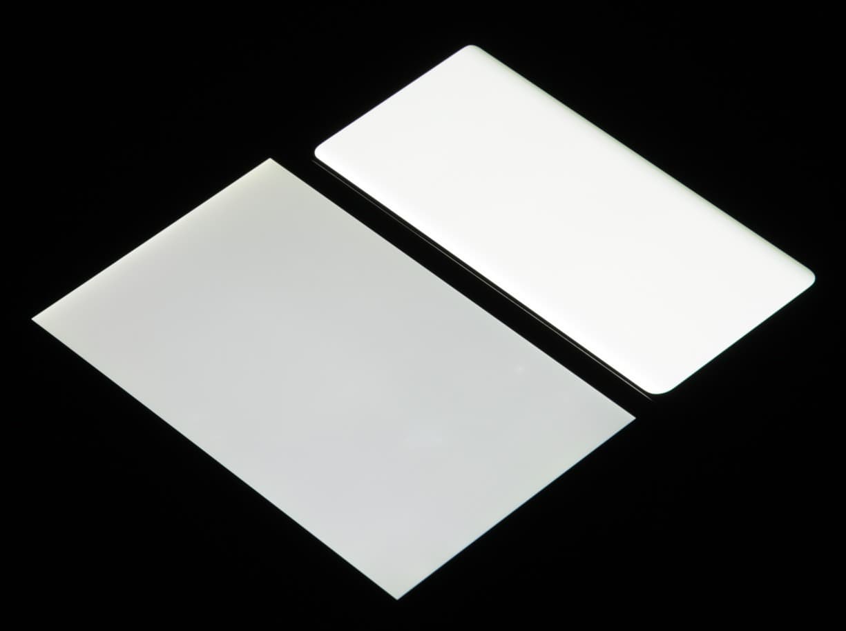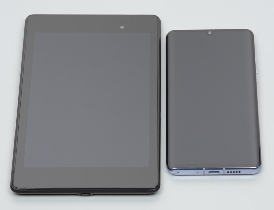 Лицевая поверхность экрана выполнена в виде стеклянной пластины с зеркально-гладкой поверхностью, устойчивой к появлению царапин. Судя по отражению объектов, антибликовые свойства экрана лучше, чем у экрана Google Nexus 7 (2013) (далее просто Nexus 7). Для наглядности приведем фотографию, на которой в выключенных экранах отражается белая поверхность (слева — Nexus 7, справа — Huawei P30 Pro, далее их можно различать по размеру):