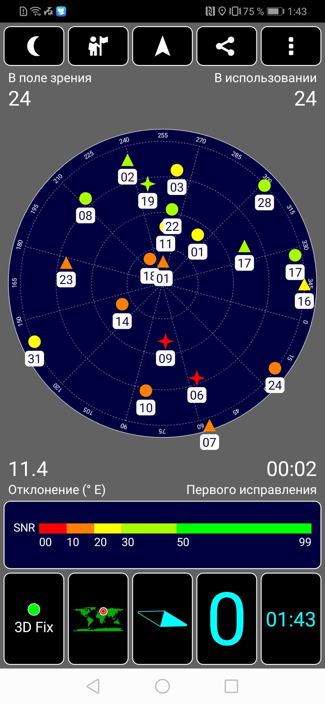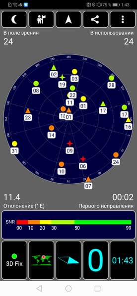 Навигационный модуль работает с GPS (двухчастотный, с A-GPS), с отечественной Глонасс, с китайской Beidou и с европейской Galileo. Первые спутники при холодном старте обнаруживаются быстро, в течение первых же секунд, точность позиционирования не вызывает претензий. Магнитный компас, необходимый для навигационных программ, на месте.