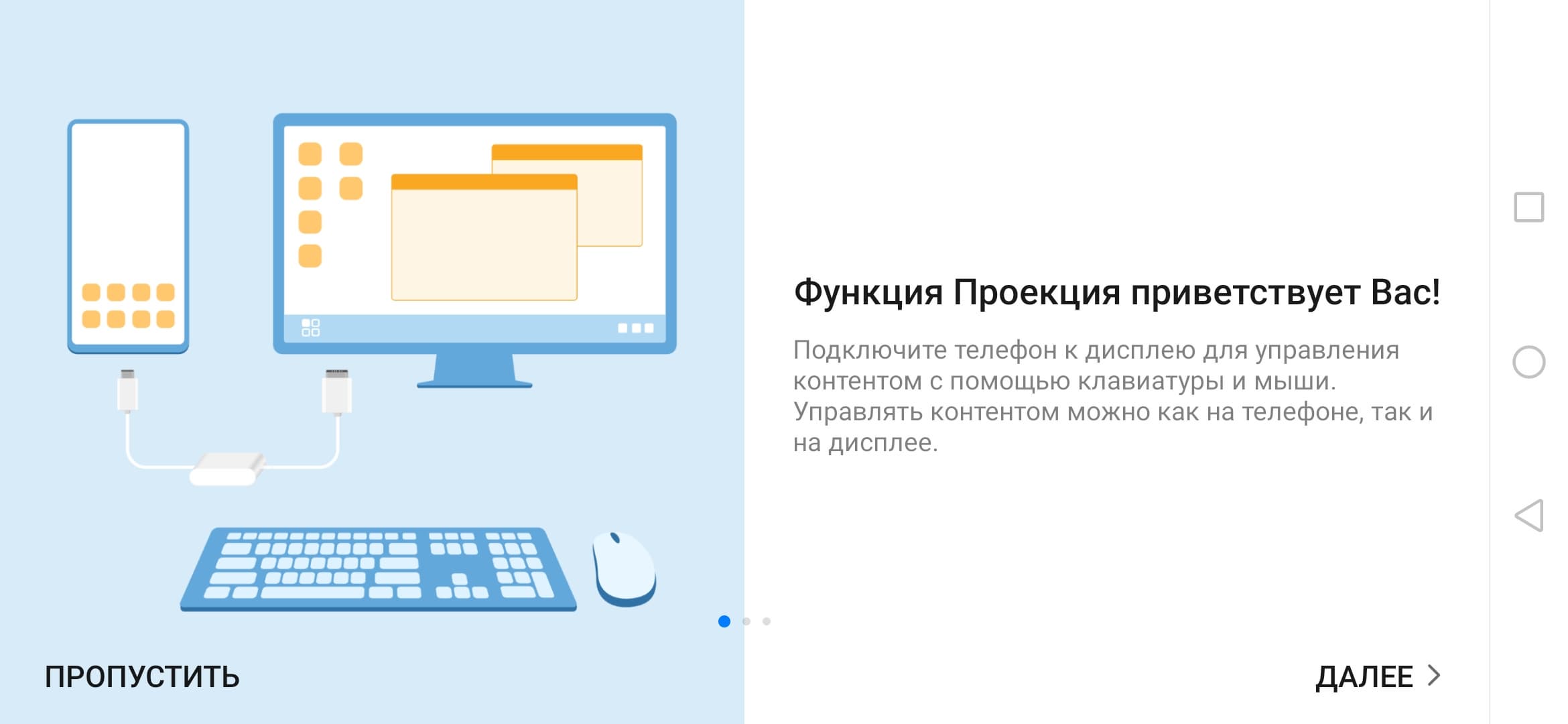 Управляющая панель в нижней части экрана убирается при выводе изображения на весь экран (например, при воспроизведении видео). Вывод осуществляется уже в истинном разрешении 1920×1080 и точка в точку. Отметим, что одновременно с выводом изображения и звука можно по USB подключать к смартфону мышь и клавиатуру, USB-флешки, использовать картовод и т. д., превращая смартфон в основу для рабочего места, но для этого адаптер или монитор (имеющий вход USB Type-C) должны допускать подключение внешних USB-устройств (то есть иметь USB-концентратор). В режиме рабочего стола на внешнем мониторе можно параллельно работать на самом смартфоне, то есть получается два рабочих стола одновременно, но вывод видео в режиме аппаратного декодирования осуществляется только на один экран, также одна и та же программа не может работать и там, и там.